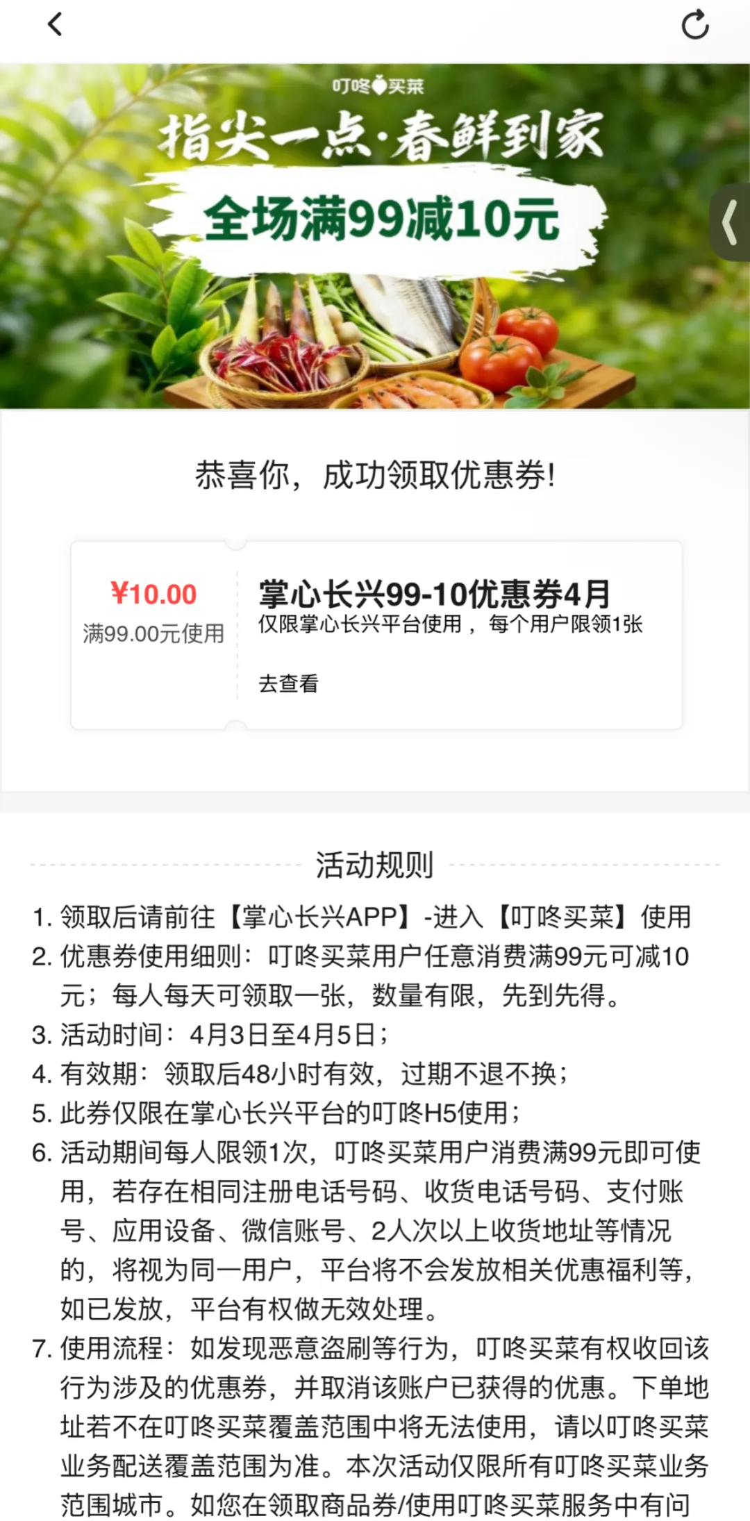 掌心长兴APP为大家申请到叮咚买菜专属福利——99减10元专属优惠券!