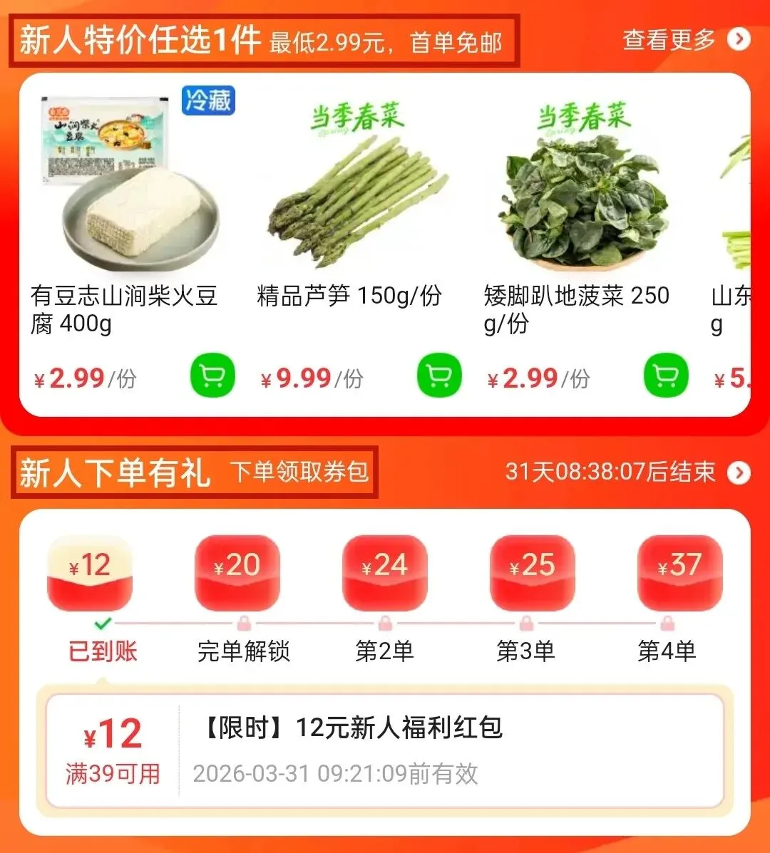 ✅ 新人特价任选1件:超值低价,首单免邮。豆腐、芦笋、菠菜……低价菜品任你挑!