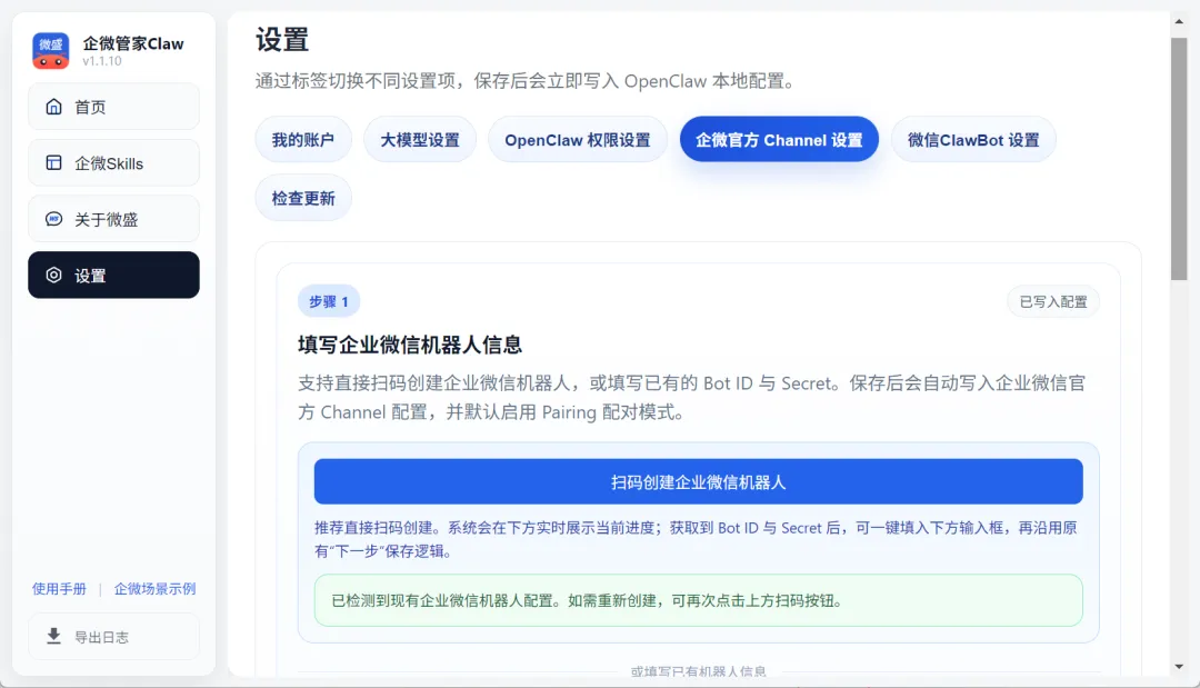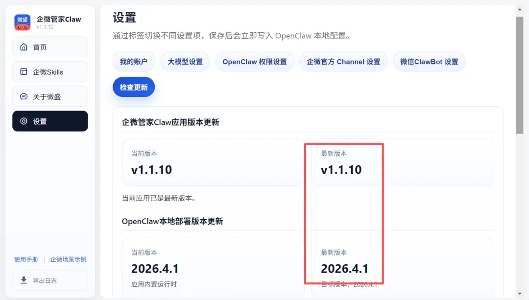 前置准备就都做好了。早就装了企微管家Claw的用户记得点一下企微管家Claw里的“检查更新”。
