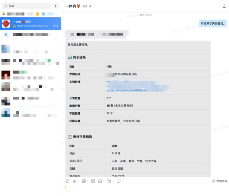 在企微群里@你的龙虾机器人,说:“帮我创建一个智能表格,叫‘4月营销活动排期’,列包括:活动名称、负责人、截止日期、状态。”