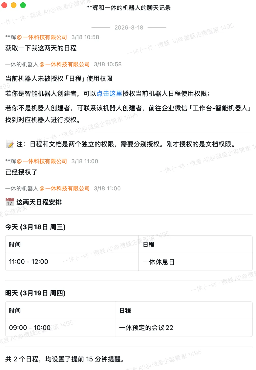 然后开始对话,语音和文字都可以,以下就是调用企微能力的对话示例: