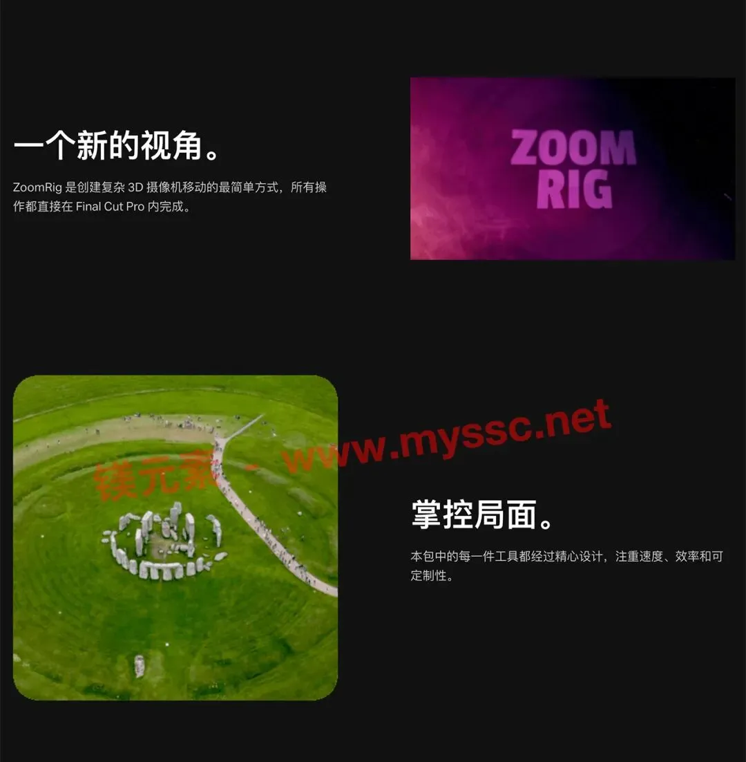 ZoomRig快速且动态地创建Final Cut Pro中此前无法实现的摄像机移动。通过易用的滑块,改变视野、景深、旋转、位置、动画类型等多种功能。