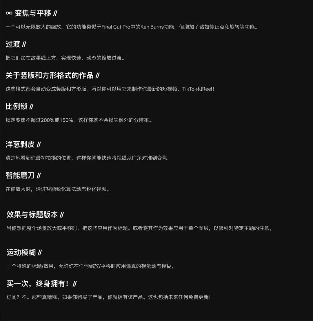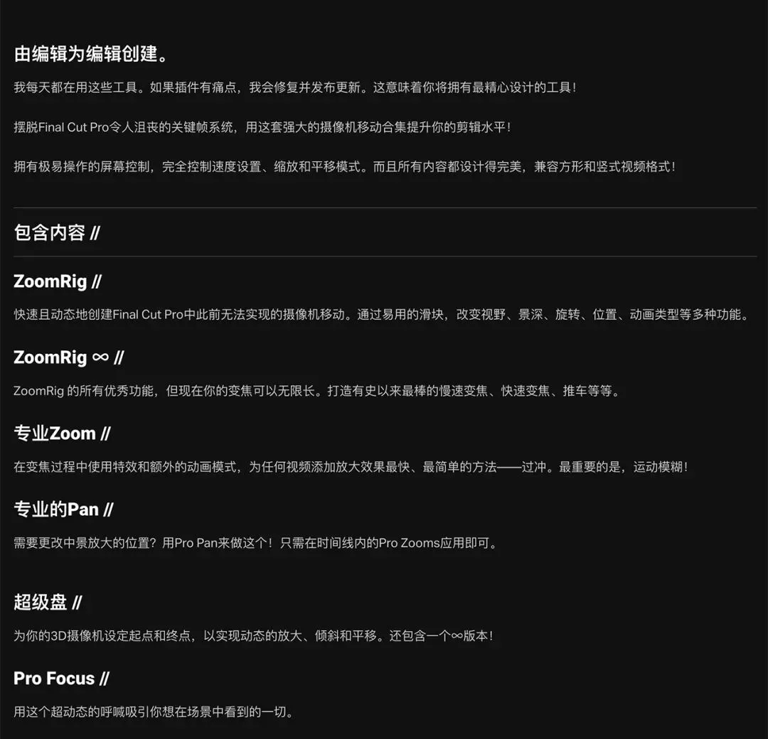 FCBs Pro Zoom 4.1.1 我每天都在用这些工具。如果插件有痛点,我会修复并发布更新。这意味着你将拥有最精心设计的工具!摆脱Final Cut Pro令人沮丧的关键帧系统,用这套强大的摄像机移动合集提升你的剪辑水平!拥有极易操作的屏幕控制,完全控制速度设置、缩放和平移模式。而且所有内容都设计得完美,兼容方形和竖式视频格式!