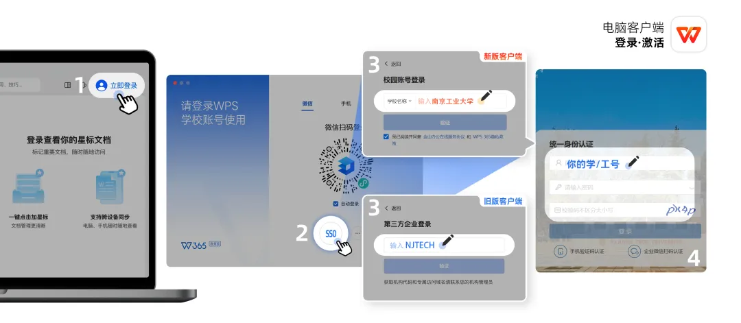 打开安装好的WPS客户端,首次登录选择右上角「账号登录」-「SSO登录」,输入学校代码njtech,点击「验证」,跳转到统一身份认证界面,输入学/工号和密码登录,后续可使用WPS协作手机端扫码登录。