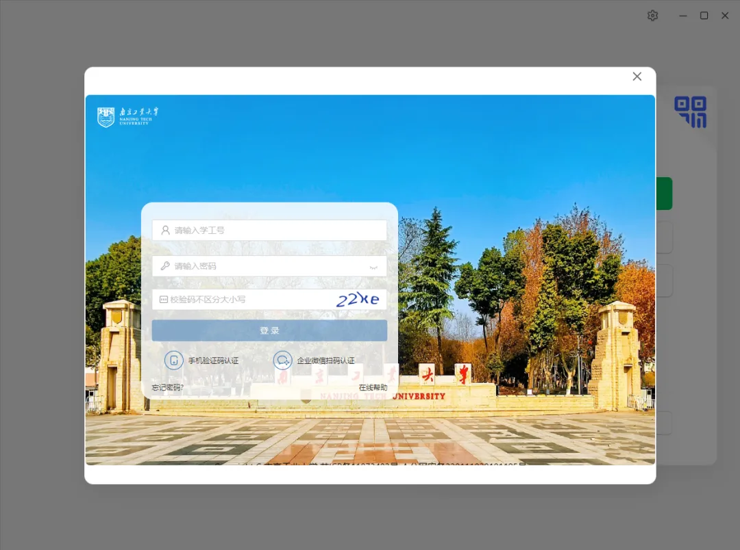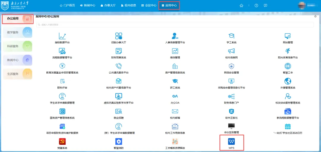 访问i.njtech.edu.cn,通过统一身份认证方式登录后,点击“智慧南工”,进入门户首页,点击应用中心