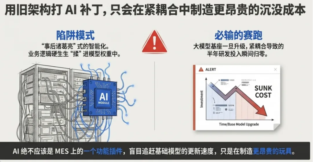 所谓的AI 插件,大多只是在做“事后诸葛亮”。最尴尬的是,你刚花半年训好一个业务模型,大模型基座就升级了。由于你把业务逻辑硬生生地“揉”进了模型权重里,这种紧耦合导致你的研发投入瞬间变成了“沉没成本”。这种“追赶式”的智能化,本质上是在跟基础模型的更新速度玩一场必输的赛跑,只会制造更昂贵的技术债。