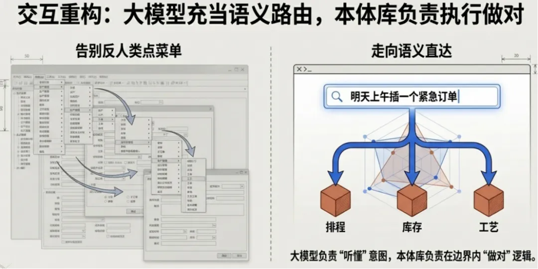 在这里,大模型充当的是语义路由(Semantic Routing)。它被严格限制在“意图解析”的范畴内,绝不允许越过本体库去直接改写运行逻辑。大模型负责“听懂”,本体库负责“做对”。