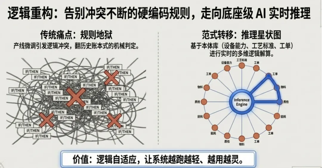 正确的做法是:把业务逻辑沉淀在本体(Ontology)中,让 AI 担任推理引擎。当异常发生时,系统不是在死代码里机械地“翻历史账本”,而是基于本体库中的设备能力、工艺标准和当前工单,进行实时的多维逻辑解算。