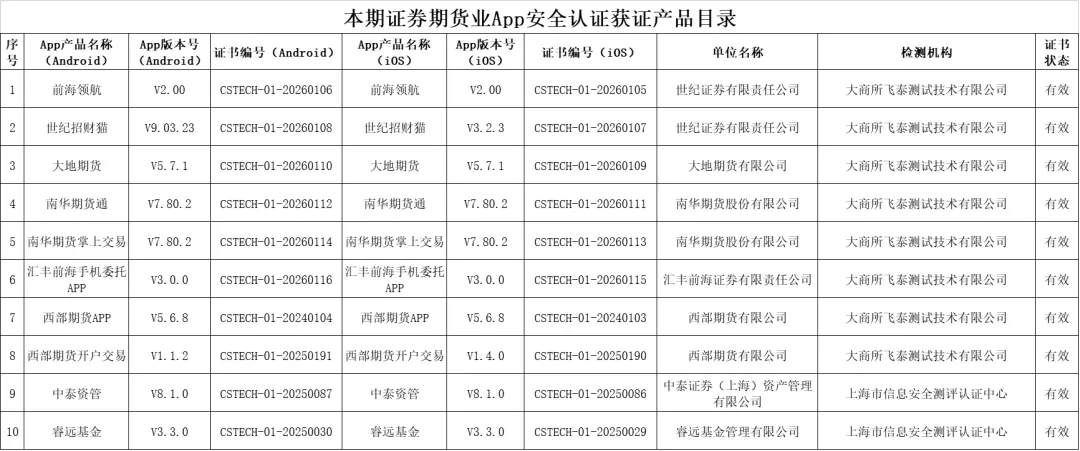 世纪证券有限责任公司的“前海领航”App等6款App通过证券期货业App安全认证,符合行业标准《证券期货业移动互联网应用程序安全规范》(JR/T 0192-2020)及《证券期货业移动互联网应用程序安全检测规范》(JR/T 0240-2021)要求,获得认证证书。