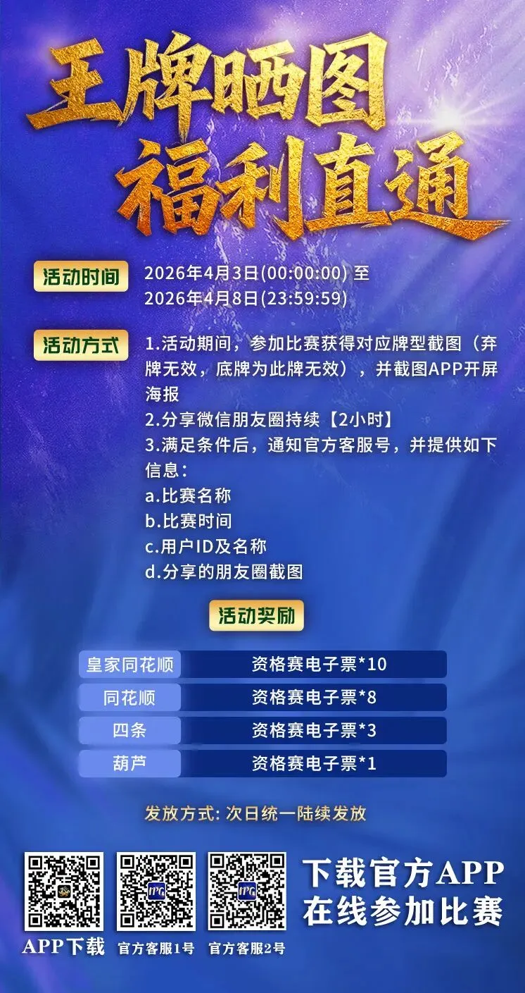 活动期间,参加比赛获得对应牌型截图(弃牌无效,底牌为此牌无效),并截图APP开屏海报