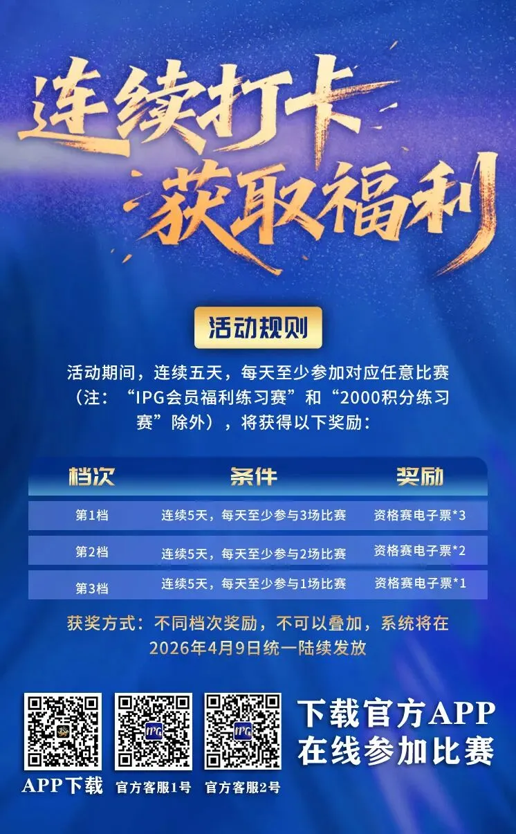 活动期间,连续五天,每天至少参加对应任意比赛(注:“IPG会员福利练习赛”和“2000积分练习赛”除外),将获得打卡奖励