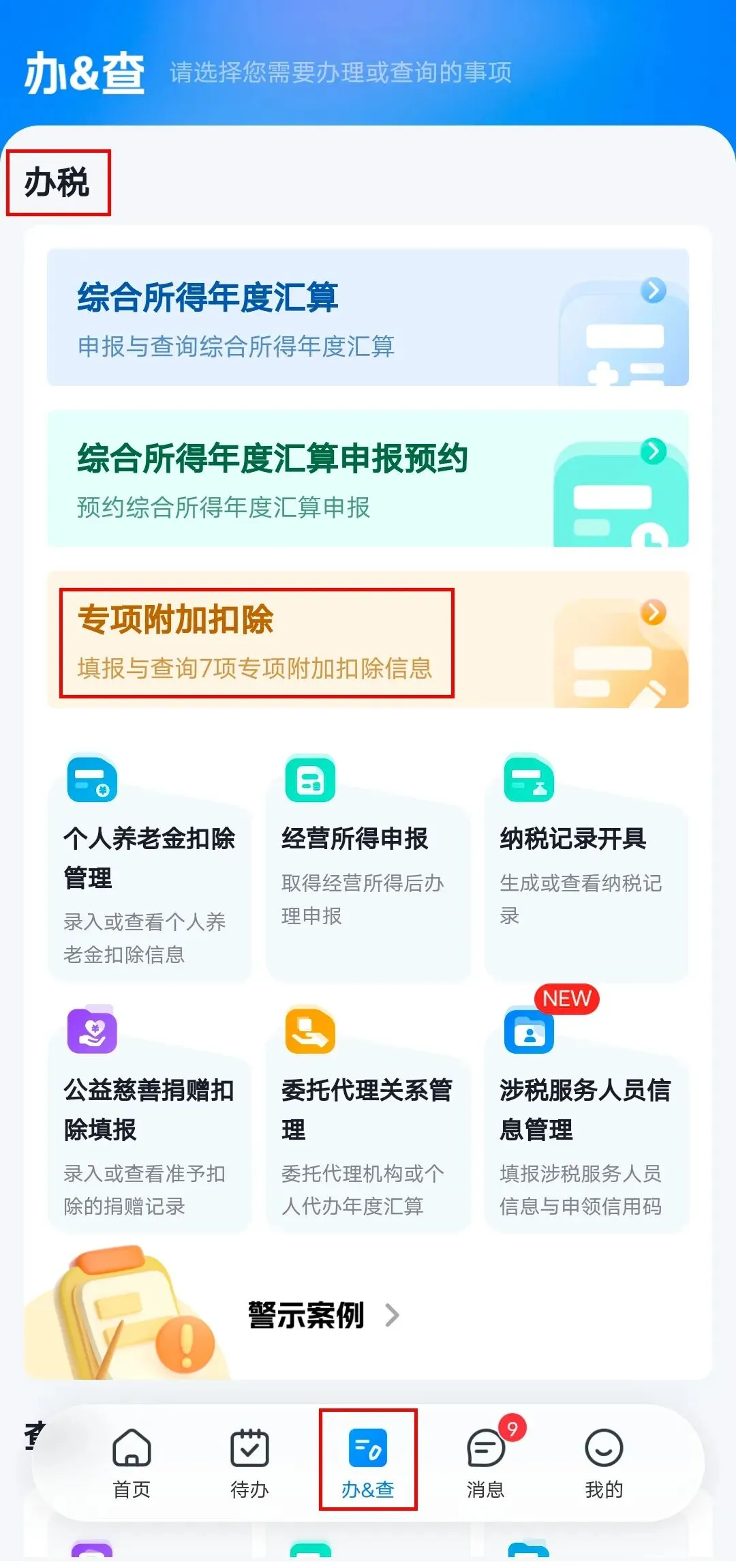 1.登录个人所得税App,依次点击【办&查】-【办税】-【专项附加扣除】,在【选择查询年度】选择“2025”后点击【确定】。