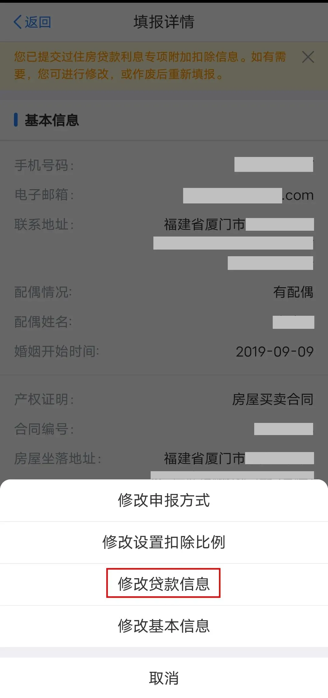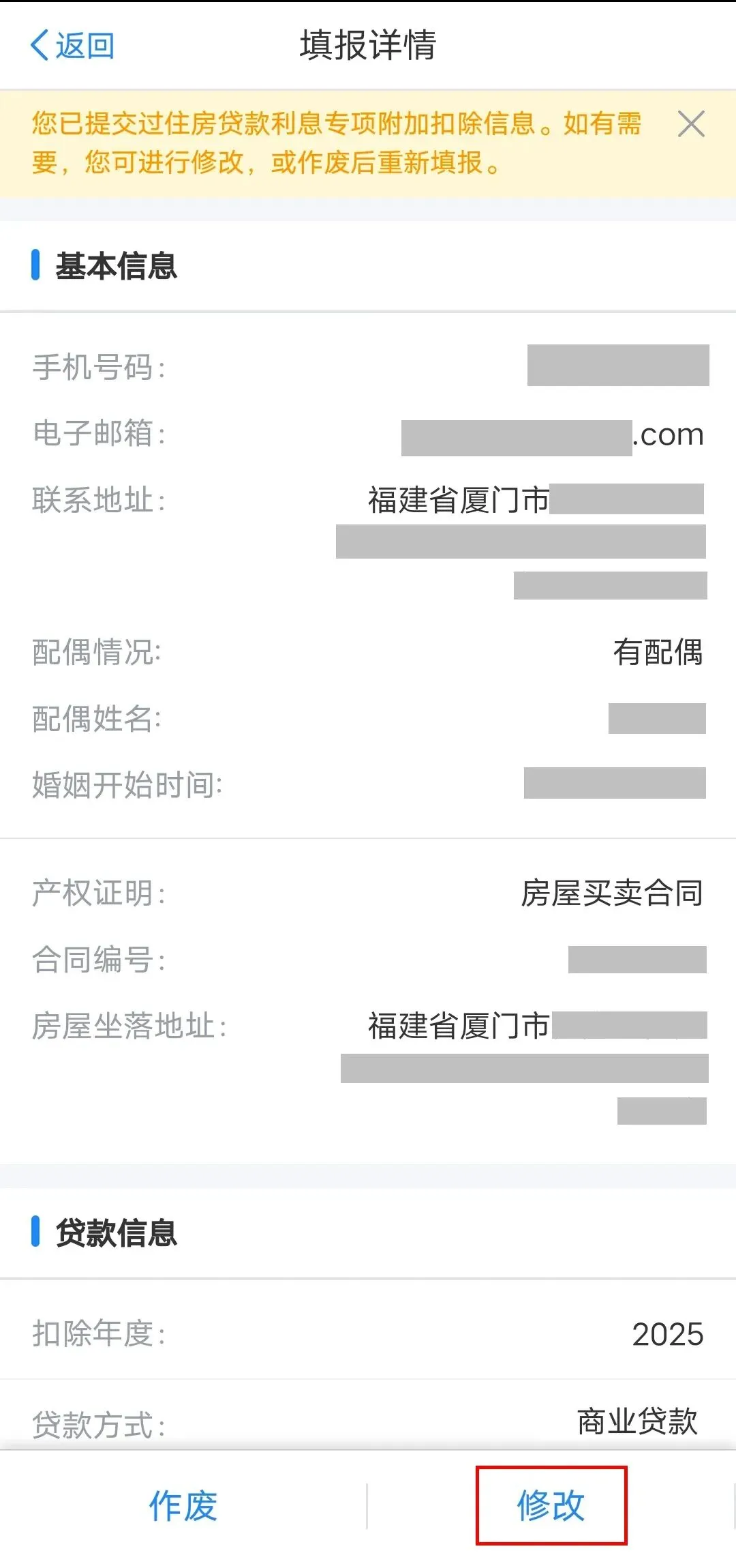 2.在填报记录选择【住房贷款利息】进入填报详情,点击【修改】。