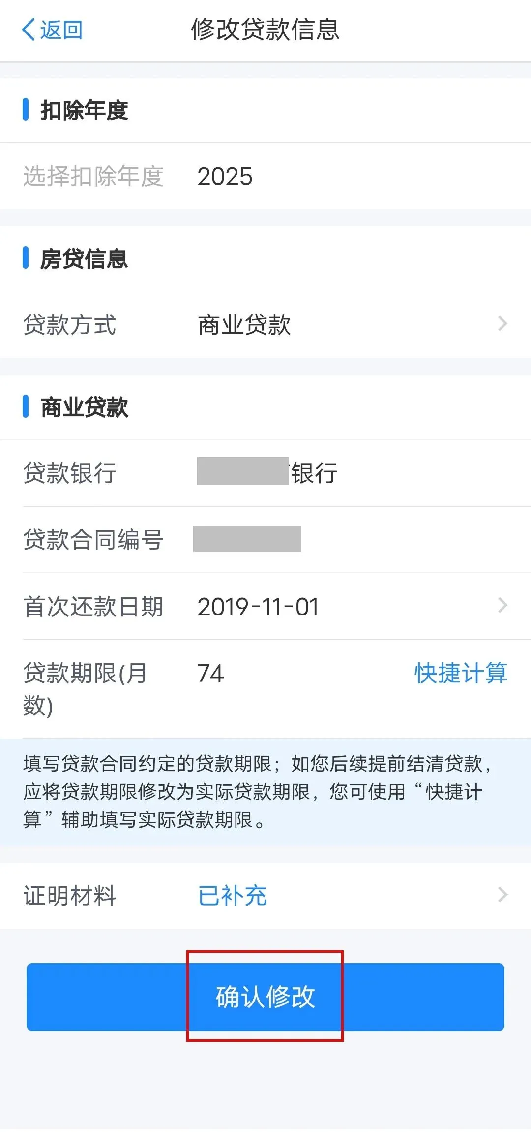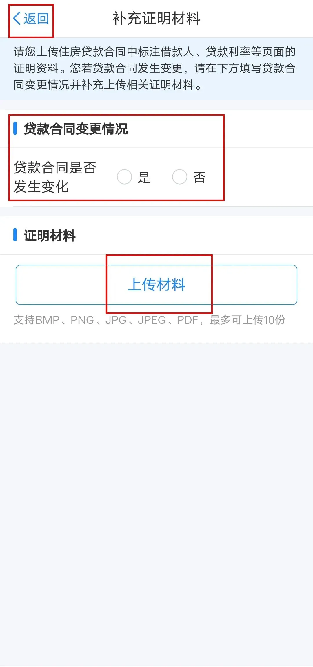 4.进入“补充证明材料”页面,确认贷款合同变更情况、上传住房贷款合同、贷款结清证明等佐证材料后点击【返回】,核对贷款信息无误后点击【确认修改】即可。