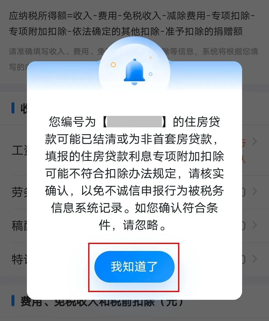 在弹出提示时,直接点击【我知道了】继续办理汇算操作即可。建议留存住房贷款合同、贷款还款凭证等资料,以备税务机关后续核实。