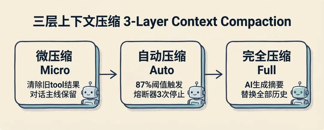 用户对话开始│▼[Level 1] 微压缩 (Micro Compaction)│ • 仅清理旧的 tool 调用结果│ • 完整保留对话主线│ • 成本最低 / 无语义损失│▼ (触发条件:token ≈ 窗口上限)[Level 2] 自动压缩 (Auto Compaction)│ • 触发阈值:窗口大小 - 13000 buffer│ • 压缩历史对话(保留关键信息)│ • 熔断机制:│ - 连续失败超过阈值 → 停止压缩│▼ (若仍超限)[Level 3] 完全压缩 (Full Compaction)│ • AI 生成整段对话摘要│ • 替换全部历史消息│ • 强约束指令:│ "只总结,不调用工具"│▼继续对话