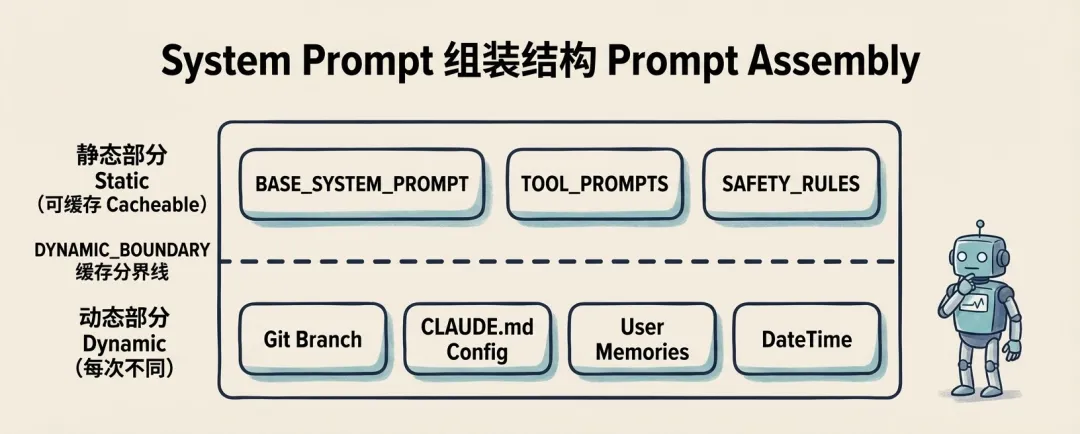 functionbuildSystemPrompt() {return [// ─── 静态部分(可缓存)───BASE_SYSTEM_PROMPT, // 基础人格和规则TOOL_PROMPTS, // 所有工具的使用手册SAFETY_RULES, // 安全规则// ─── 缓存分界线 ───SYSTEM_PROMPT_DYNAMIC_BOUNDARY,// ─── 动态部分(每次不同)─── gitBranch, // 当前 Git 分支 claudeMdConfig, // CLAUDE.md 项目配置 userMemories, // 用户偏好记忆 currentDateTime, // 当前时间 ];}
