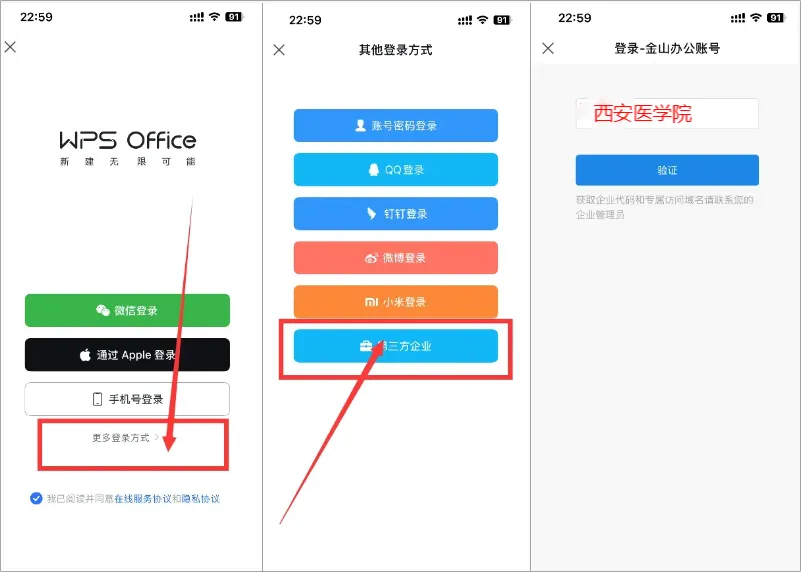 激活:选择“更多登录方式”—点击“第三方企业”—输入企业代码“西安医学院”—进入西安医学院统一身份认证界面—使用学号/工号登录。