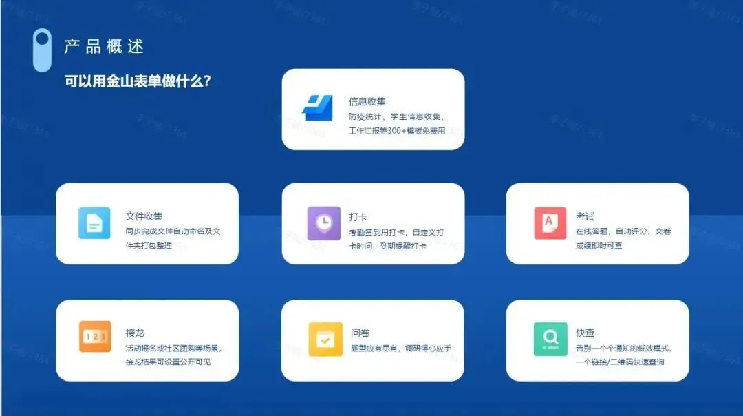 可以进行信息收集、考试、打卡、接龙、问卷、投票等,实现百万条数据轻松收集。表单模板库还有海量现成模板,缩短你的创建时间。