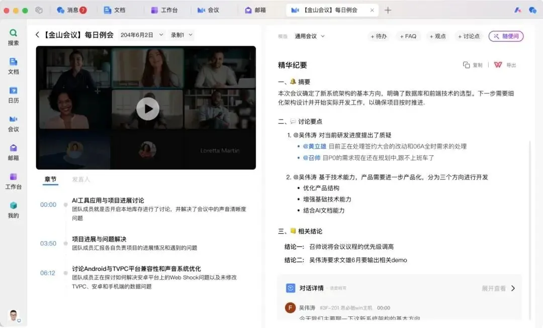 登录西安医学院专属账号可发起200人内,单次24小时上限会议,任何人均可加入会议。还具备AI会议纪要功能,不仅包含会议总结、章节划分,还能提炼重点内容并通过时间戳精准定位。