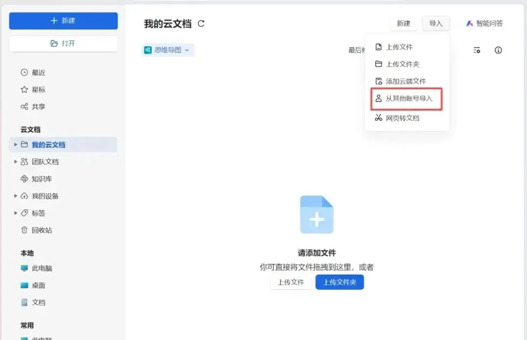 打开【我的云文档】——点击右上角导入,同时登录迁移账号和被迁移的账号,选择文档迁移。【我的云文档】里的文件仅自己看见,【团队文档】里的文件,团队成员可见。