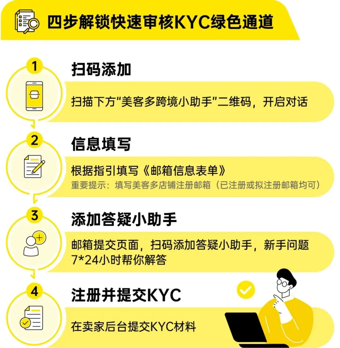 跨境AI助手为您扫清运营初期的信息障碍,KYC绿色通道助您极速完成入驻审核——两大福利并行发力,让“新手期”不再焦虑,起步更从容。