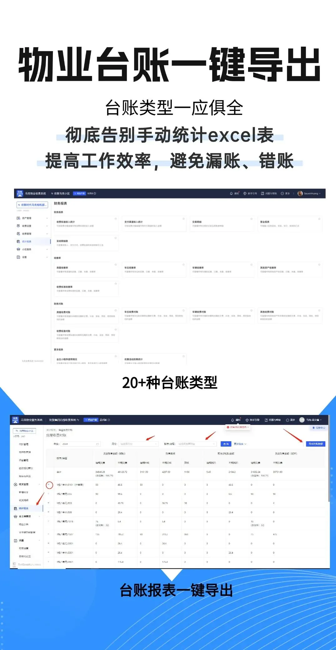 每日流水、实收金额、欠费总额…需要从海量账单中手动汇总。面对“住宅管理费”、“车位费”、“公摊电费”等多种收费标准,核对每一笔收支都如同大海捞针,工作效率低下,且难以保证100%准确。