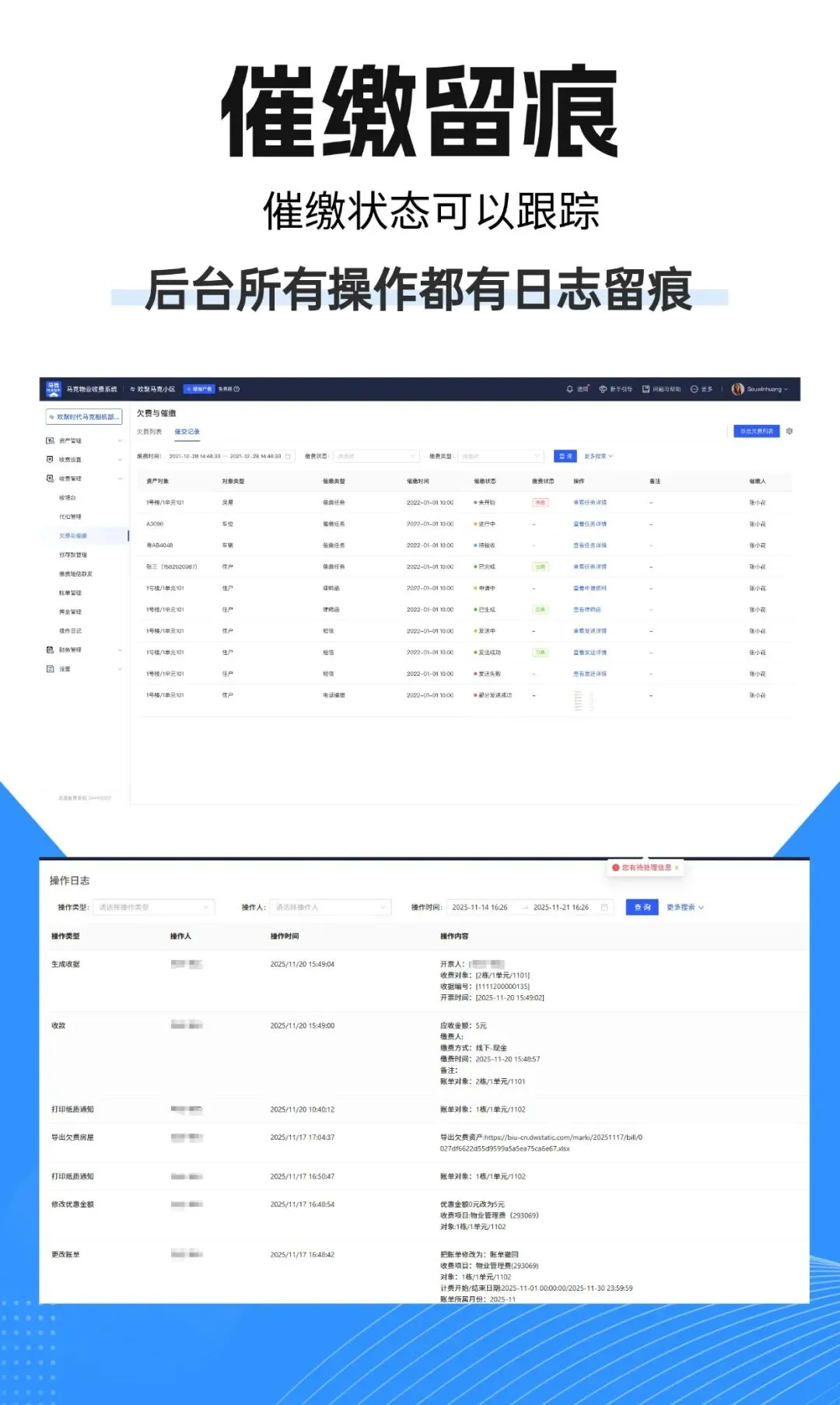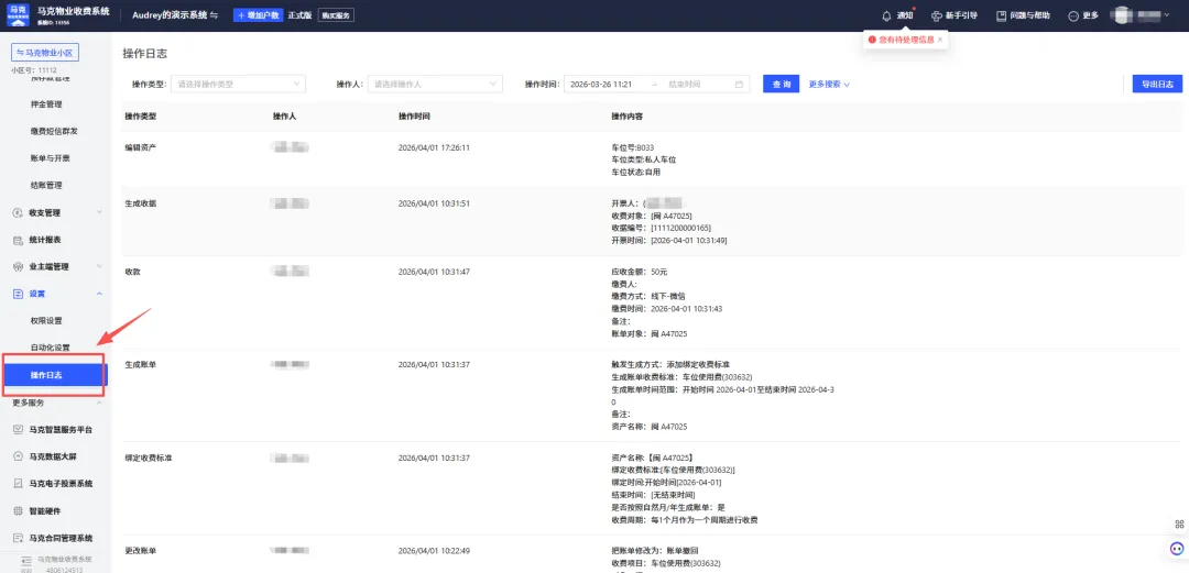 系统提供多维度财务报表,可清晰统计实收、欠费、预存情况,并自动计算收缴率。所有操作均有操作日志记录,任何一笔账单的修改、导出、收费动作都能追溯到具体操作人,让财务管理透明、可追溯。