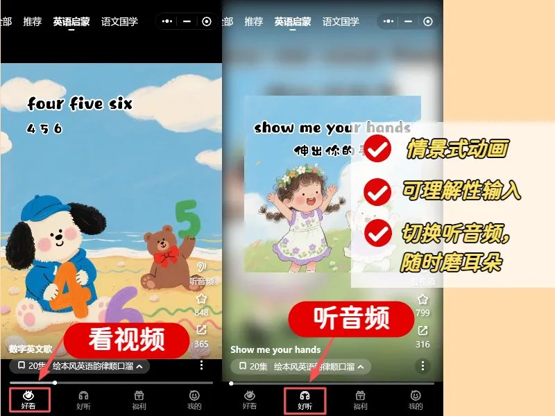 内容专业又抗打:从英语儿歌、高频单词到常用句式、情景动画,分类清晰,按年龄匹配。特别是它的英语启蒙动画支持同步跟读模块,娃跟着读就有星星奖励,互动感超强,完美解决“只输入不输出”的痛点。