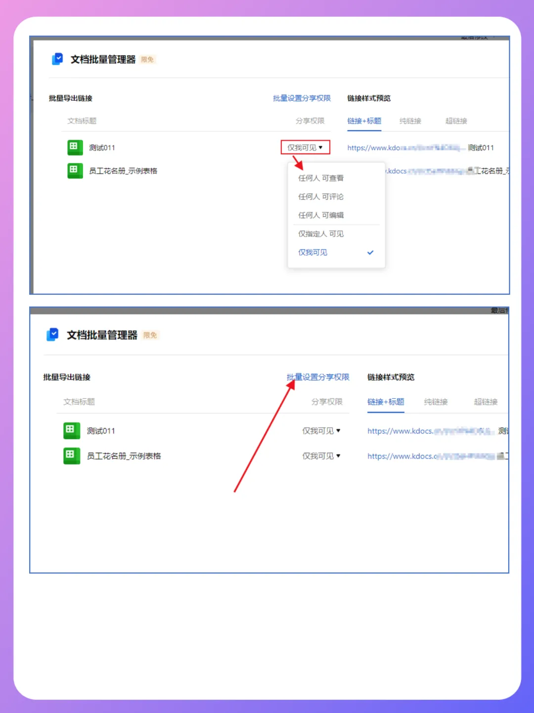 点击每一个文档设置分享权限,或者点击【批量设置分享权限】进行批量设置分享权限