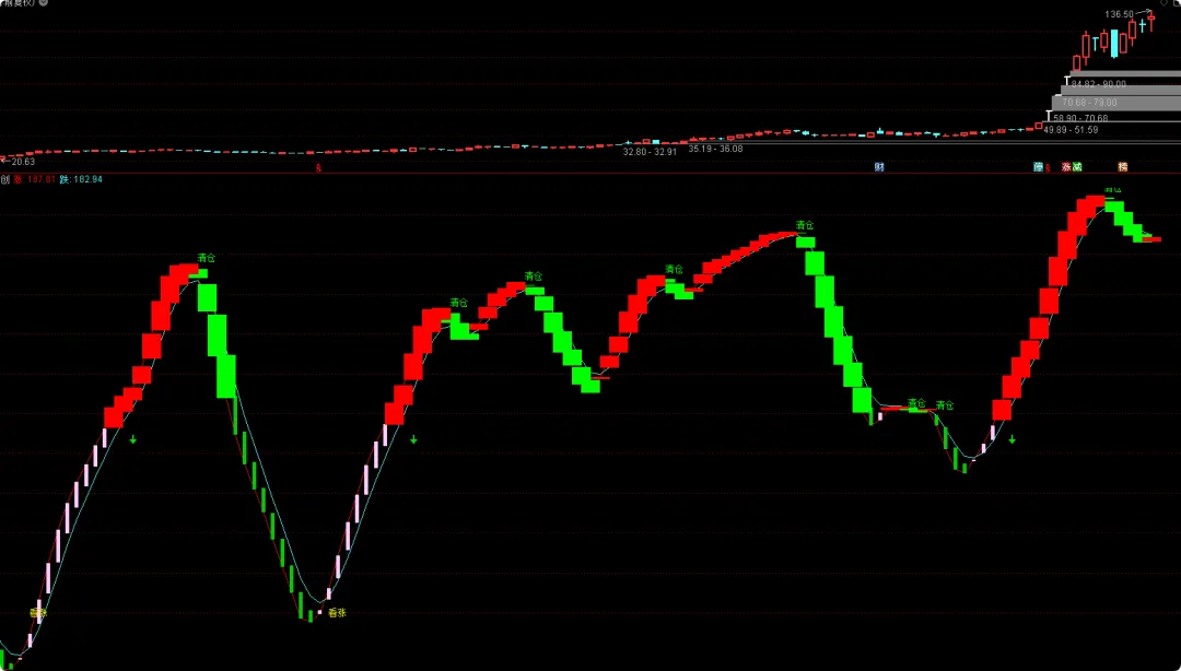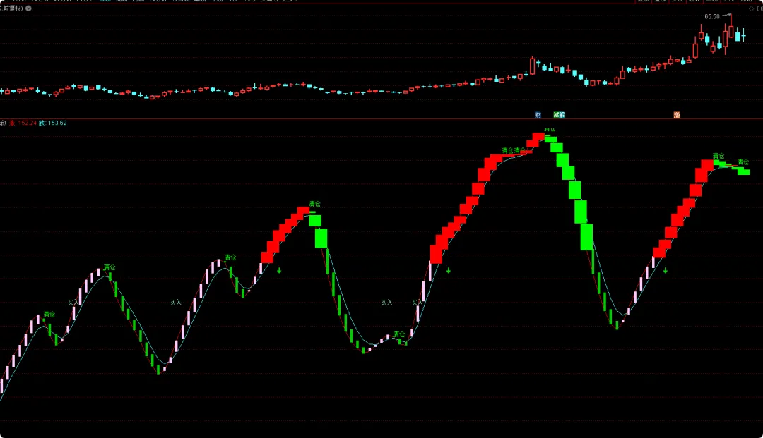DRAWTEXT(CROSS(REF(看涨,1),看涨),REF(看涨,1)*1.02,’清仓’),COLORGREEN;