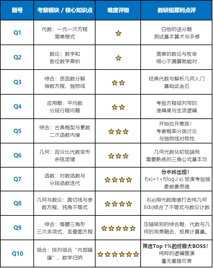 顶尖大脑的角斗场 (Q10):引入全新概念“内部峰值”,要求推导一般情况 n 的闭式表达式。这道题没有任何公式可以套用,完全考察考生的数学直觉和严密的说理证明能力。