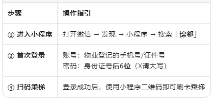 山水时代大厦 | 通知:原梯控APP即将停用,请务必于4月3日前完成切换! 原梯控停用! 请切换「锦邻」小程序 🔔 重要提醒:4月1日起,电梯刷卡全新升级! 原「高锦社区」APP将正式停用,全新梯控服务将由「锦邻」微信小程序承接。请您在4月3日前完成切换,以免影响正常乘梯出行。 三步搞定,轻松切换 🔐 安全小贴士:首次登录后,建议进入【我的】→【设置与服务】→【设置】,修改为熟悉的账号密码,保障账户安全。 重要提示 ⏰ 切换期限:4月1日 – 4月3日 期间务必完成操作 🆘 遇到问题:无法登录或提示用户不存在,请至物业前台核实办理 扫码直达 微信扫码进入「锦邻」微信小程序 END