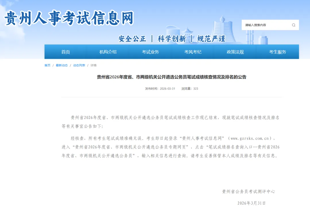 2026年度贵州遴选公务员笔试排名查询入口