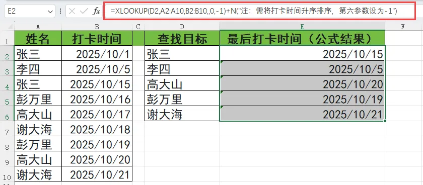 =XLOOKUP(D2,A2:A10,B2:B10,,0,-1)+N(“注:需将打卡时间升序排序,第六参数设为-1”)