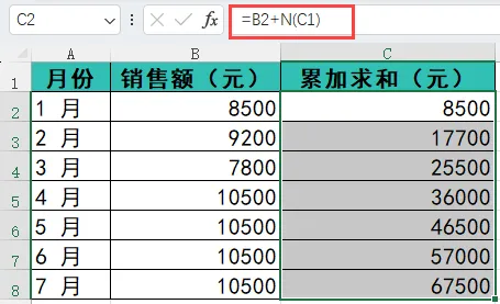 做累加求和时,表头是文本格式,直接用 =B2+C1 会报错。用 N 函数转换表头,就能让公式从第一行开始正常计算。