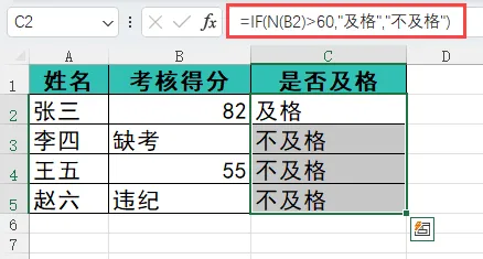 当数据中混合了文本(如 “缺考”“违纪”)和数值时,直接用 IF(B2>60,”及格”,”不及格”) 会出错 —— 因为文本和数字比较会返回TRUE,导致判断错误。用 N 函数转换后,文本会被转为 0,判断结果就准确了。