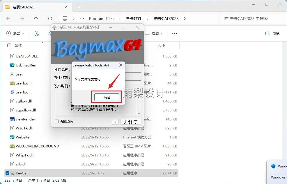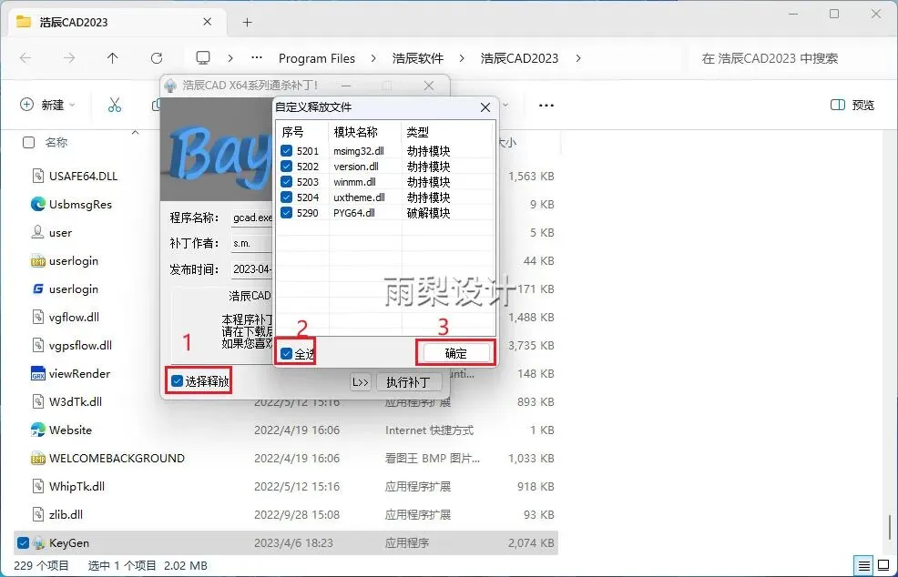 13.依次操作:选择【释放打勾】;勾选【全选】;点击【确定】备注:如果运行时被系统强行删除,右键从新复制进来,当运行之后快速操作这步(只需要点三下即可)。有时即使关掉了实时防护,运行时win也会检测删除