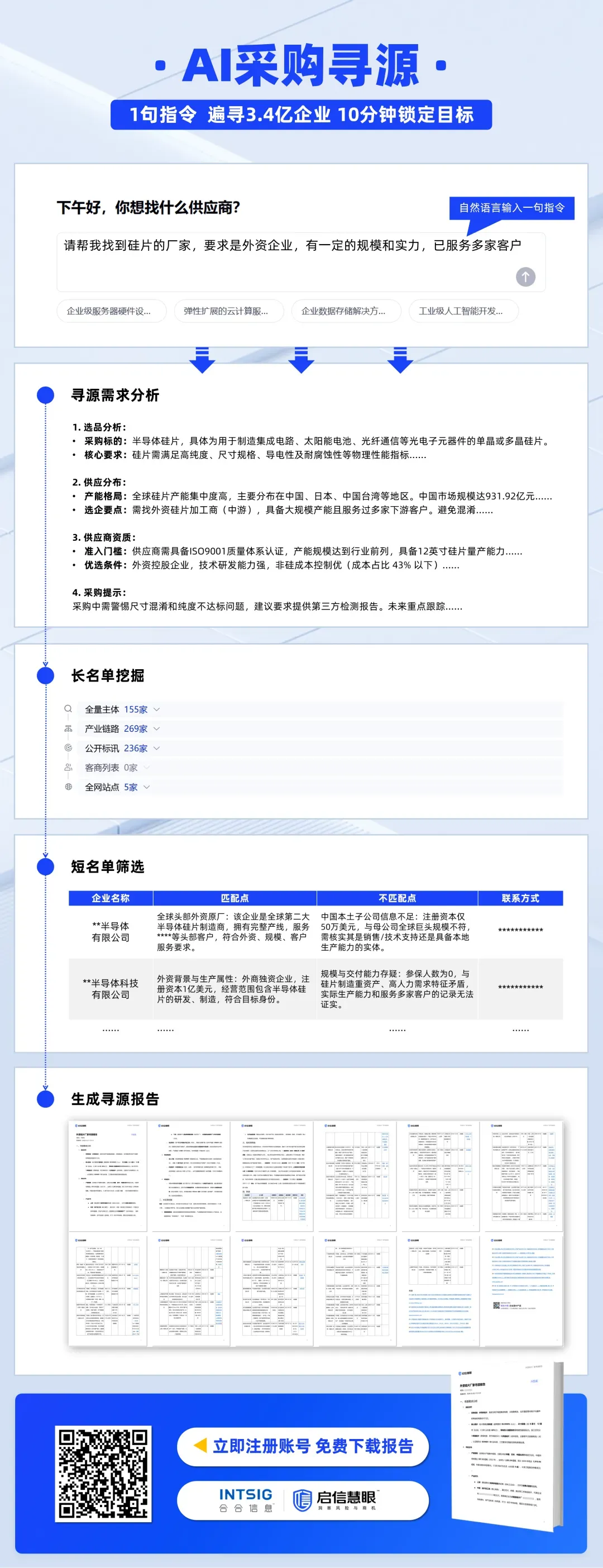 ,自动分析寻源需求,梳理选品要求、供应分布、核心资质 - 5分钟内遍寻3.4亿家企业
