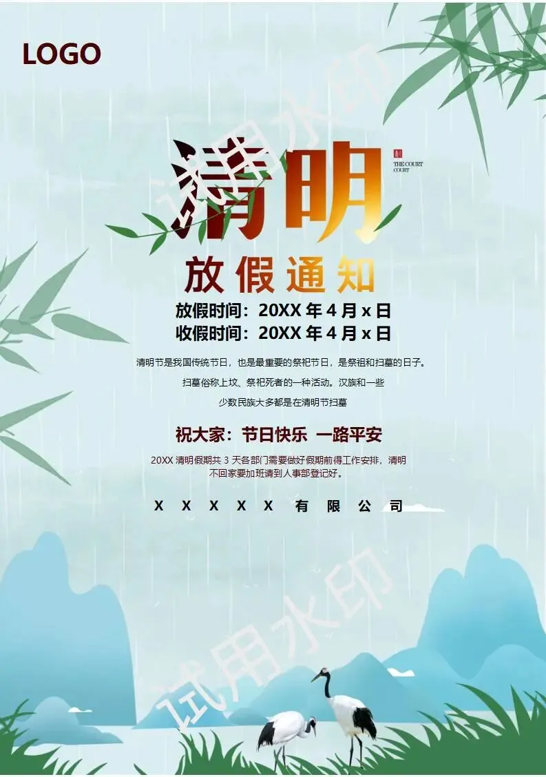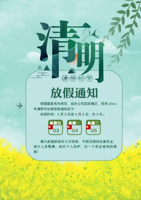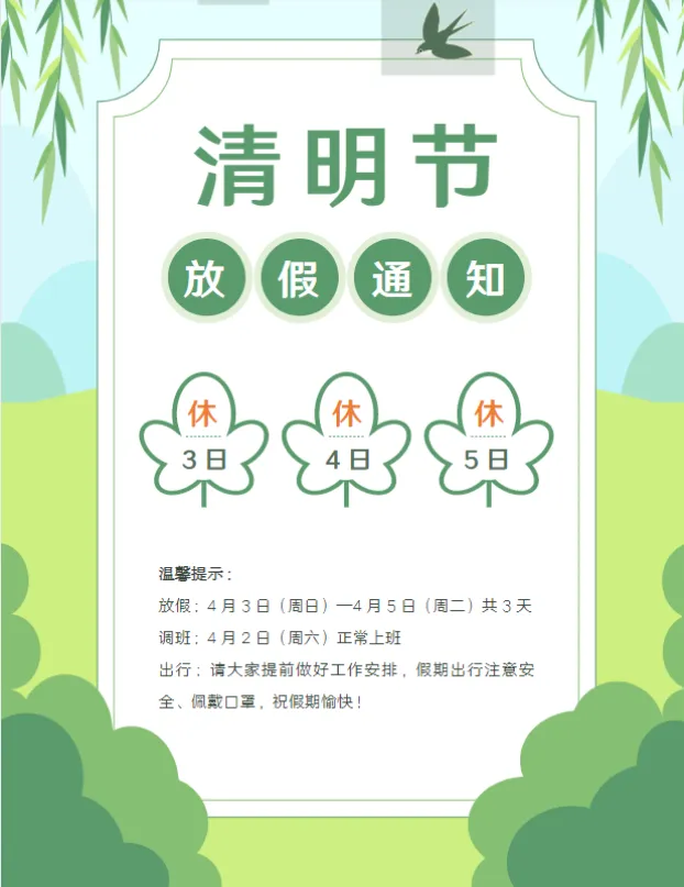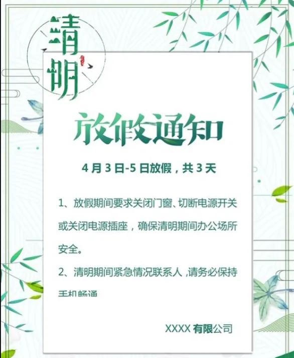 清明节放假通知的核心是 “信息明确 + 安全提醒”,跟着模板修改,既能保证规范合规,又能节省制作时间。如果需要针对某类场景(如高校、外贸公司)细化模板,或想要 “通知配图设计参考”,欢迎评论区留言~