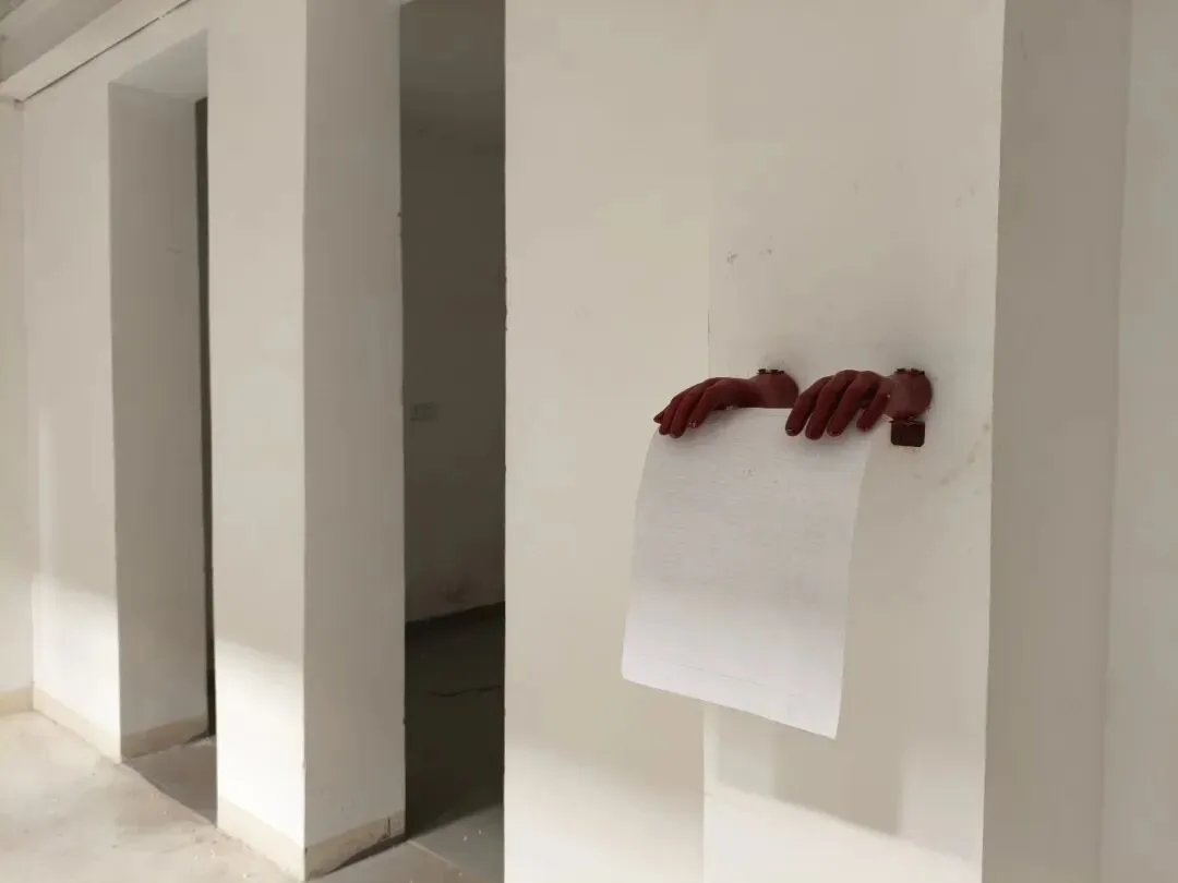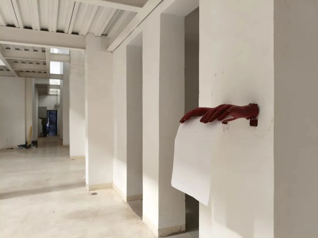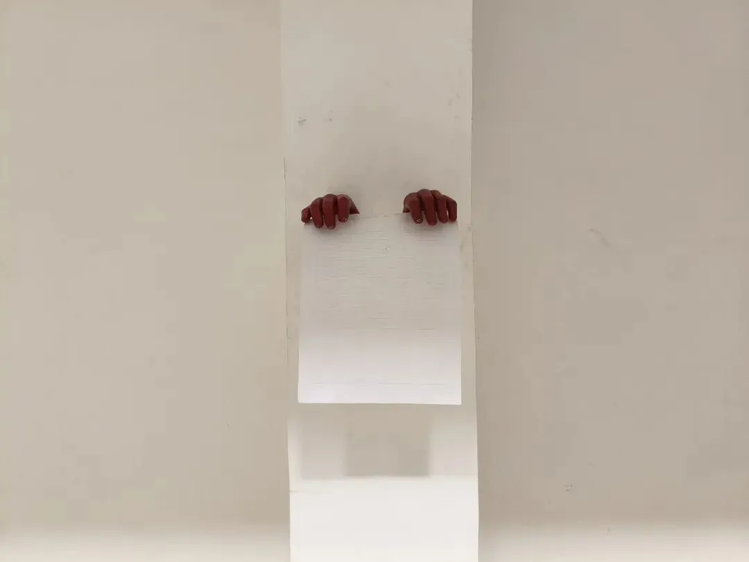 1、《一张废纸好画画》形态为一双固定在墙面的假手,手心向下,手掌内分别有一个夹子,可供参与者固定自己的作品。
