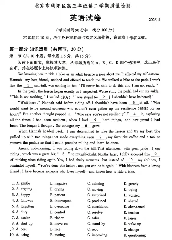 小编整理了2026年北京市朝阳区高三一模英语,PDF版!可以参考练习。
