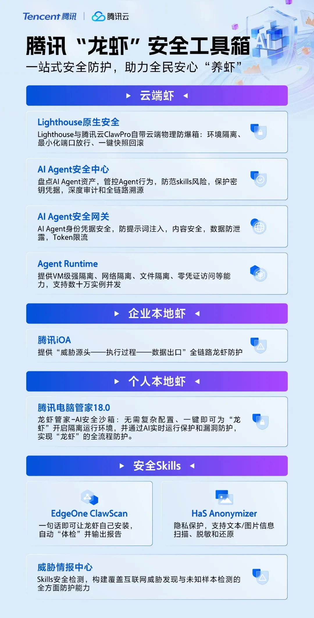 Lighthouse原生安全 Lighthouse与腾讯云ClawPro自带云端物理防爆箱:环境隔离、最小化端口放行、一键快照回滚AI Agent安全中心 盘点AI Agent资产,管控Agent行为,防范skills风险,保护密钥凭据,深度审计和全链路溯源AI Agent安全网关 AI Agent身份凭据安全,防提示词注入,内容安全,数据防泄露,Token限流Agent Runtime 提供VM级强隔离、网络隔离、文件隔离、零凭证访问等能力,支持数十万实例并发