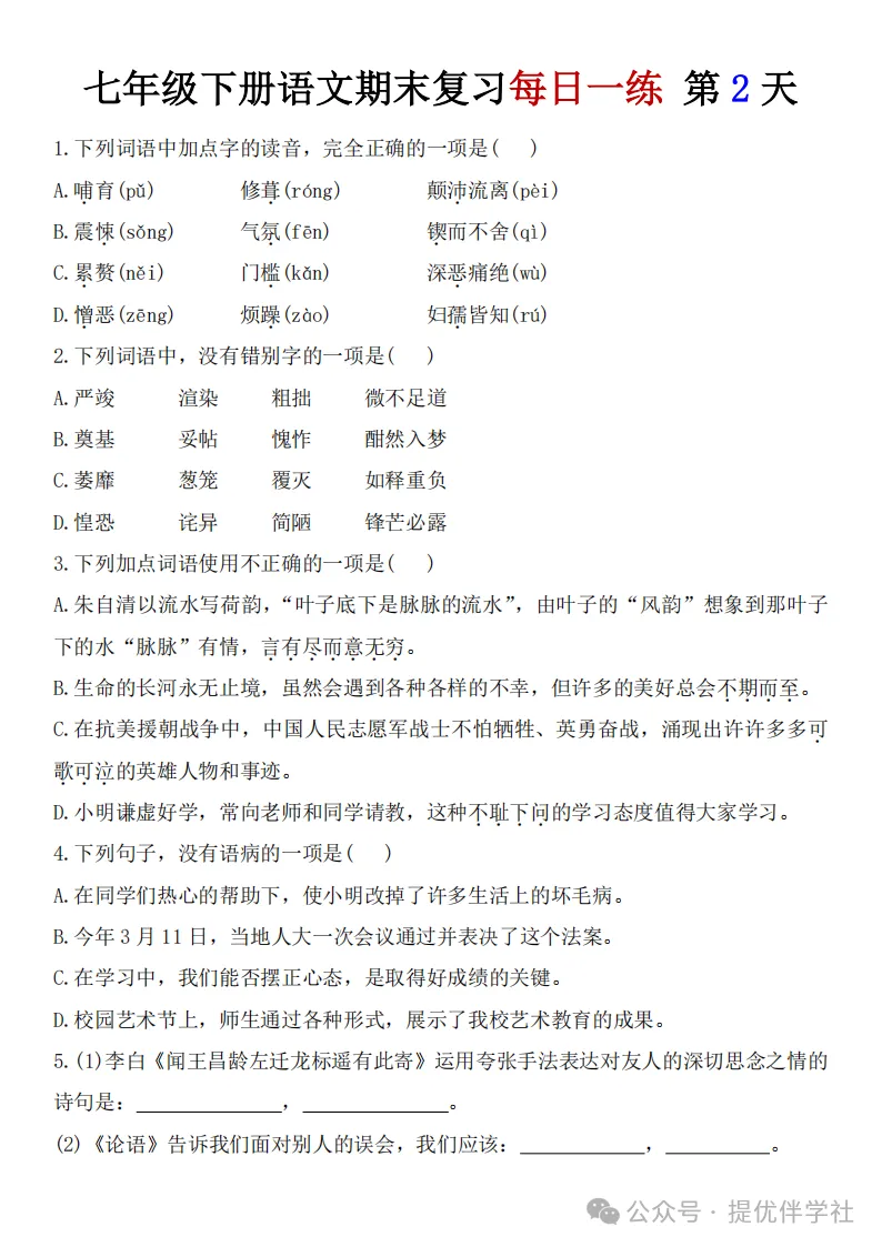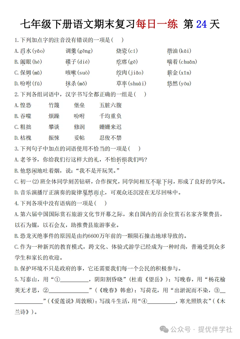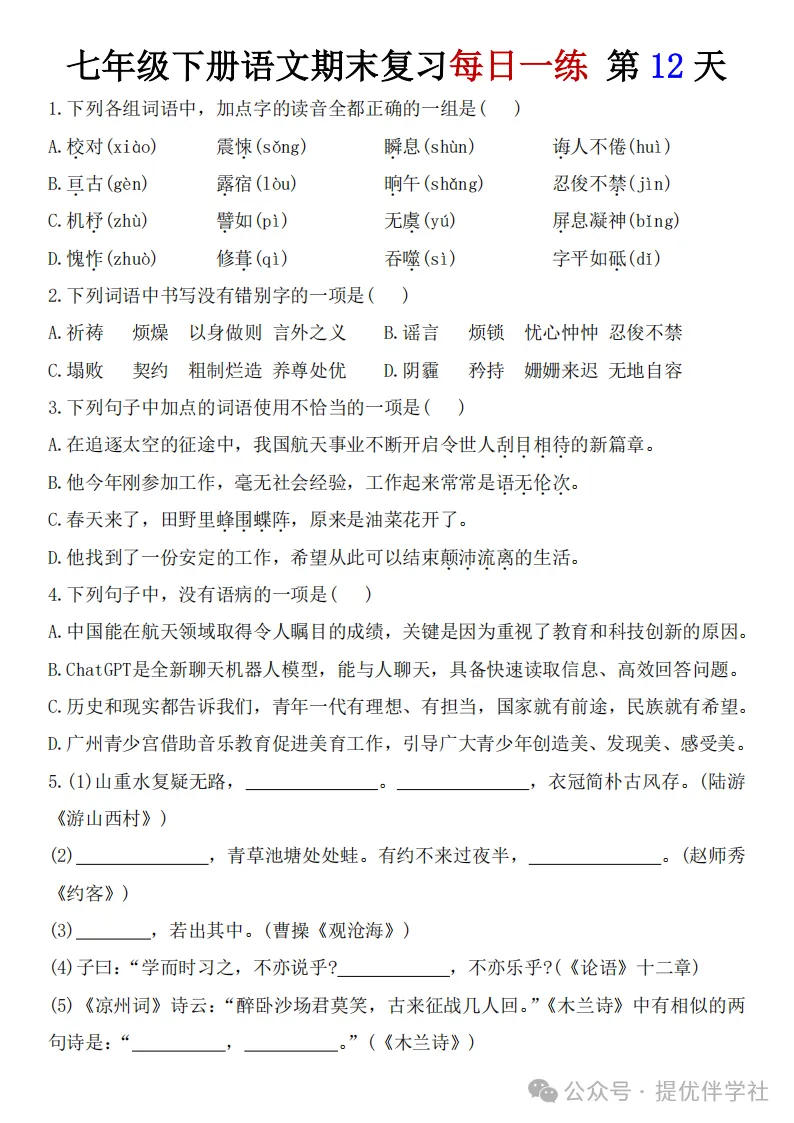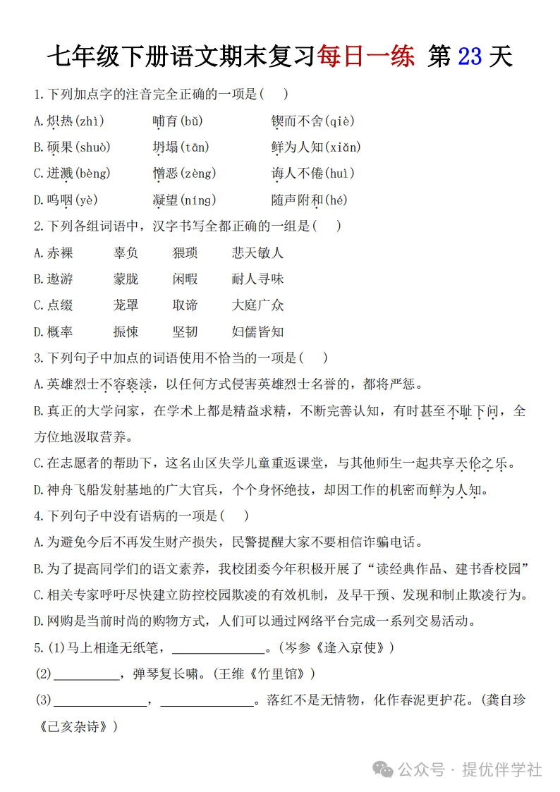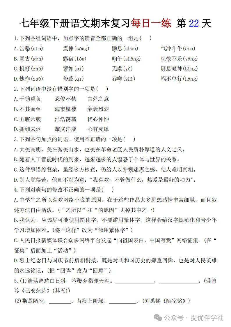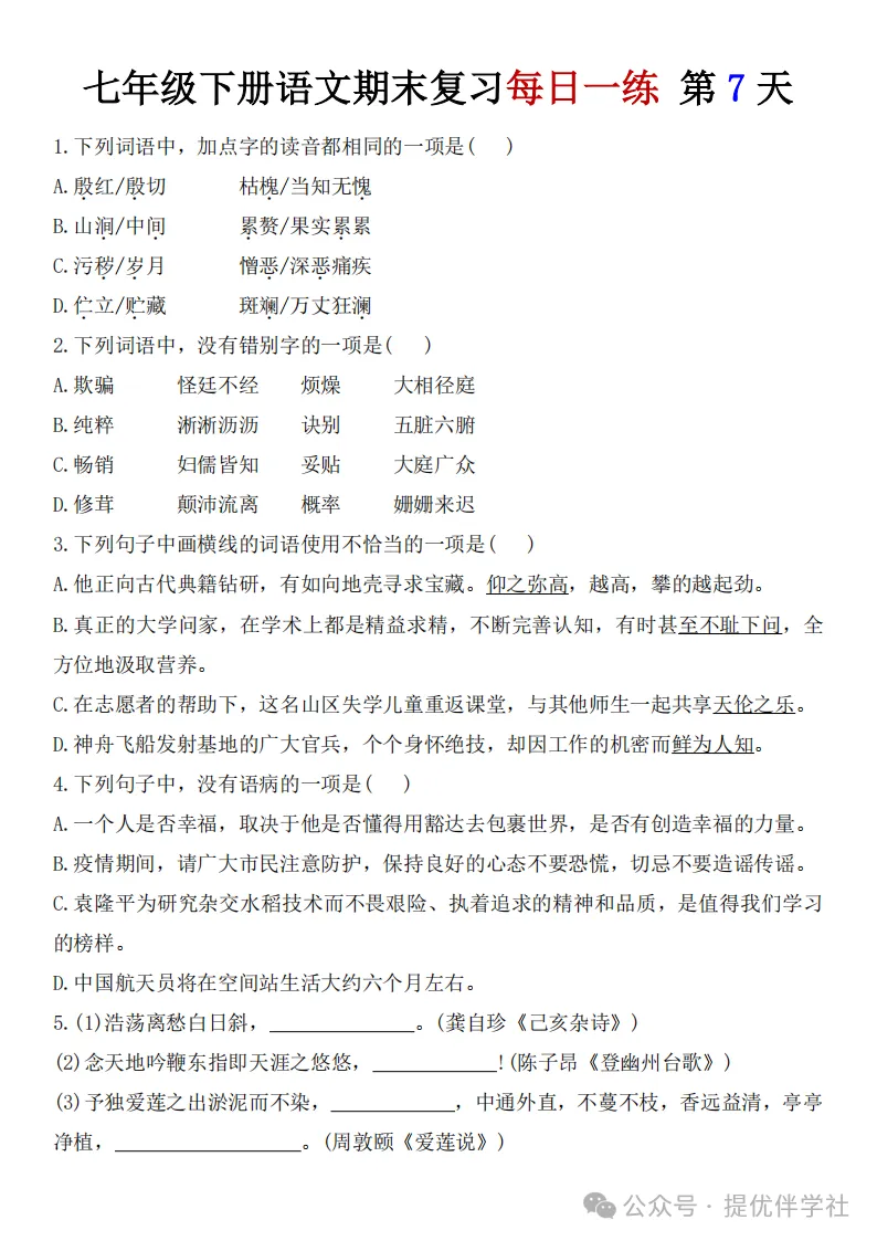 七年级语文下册《每日一练》,可下载