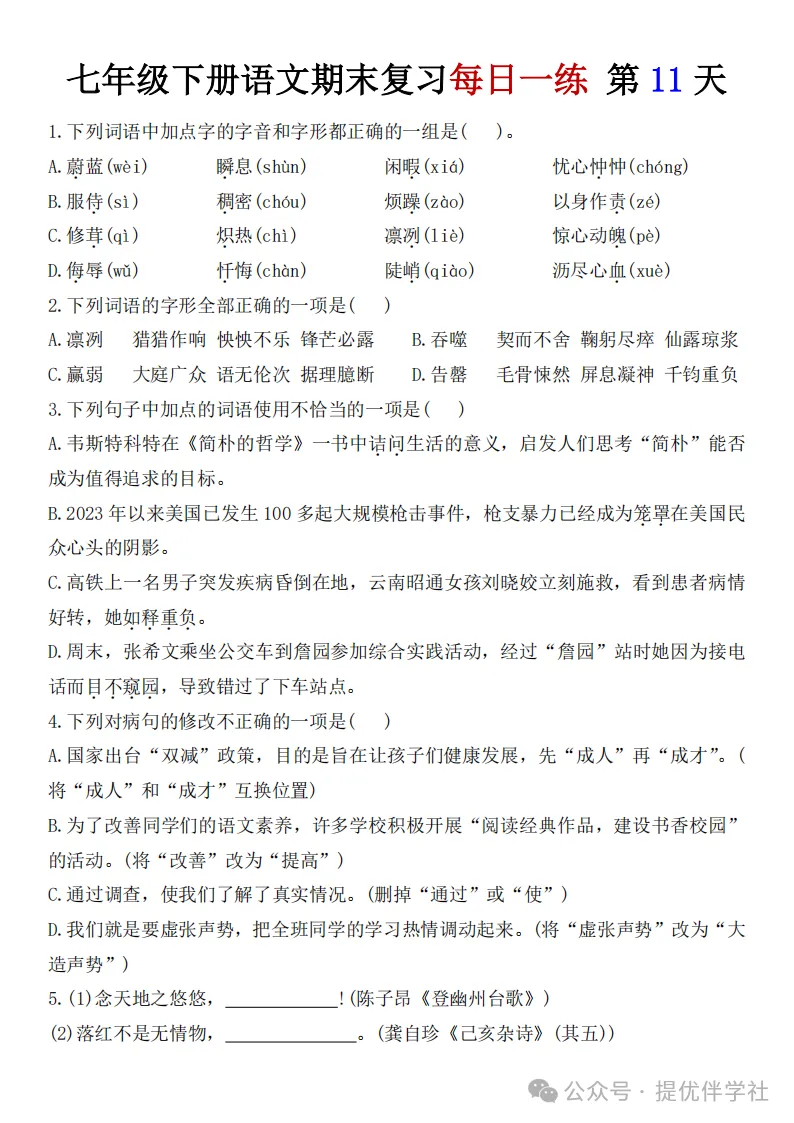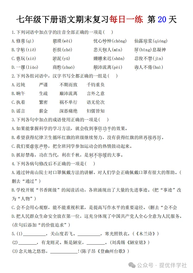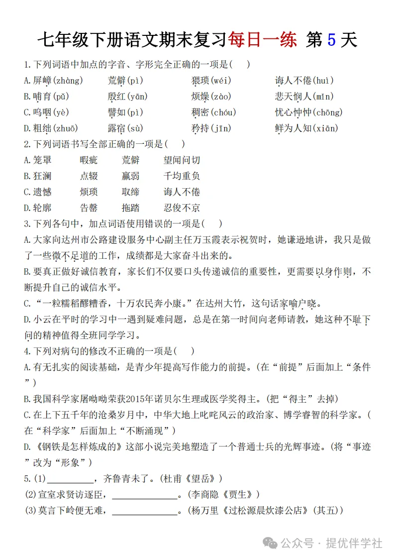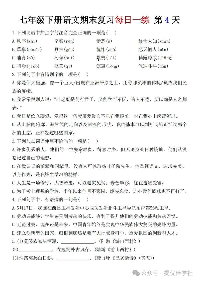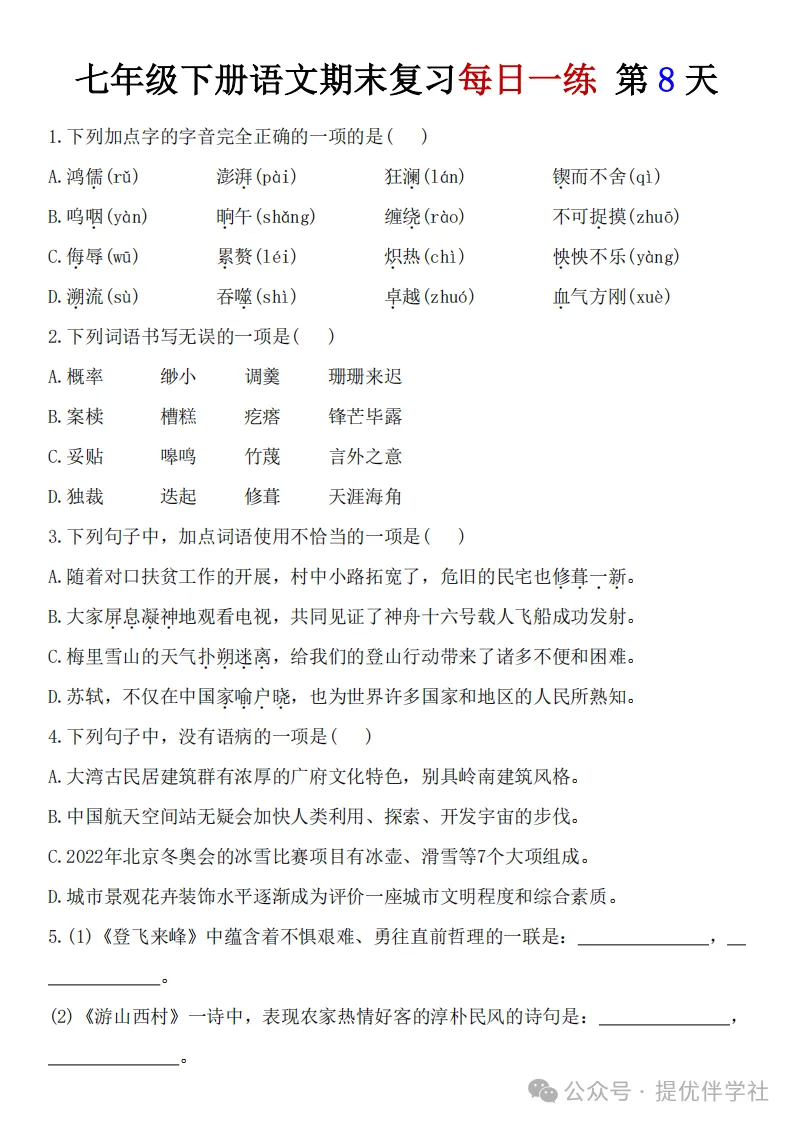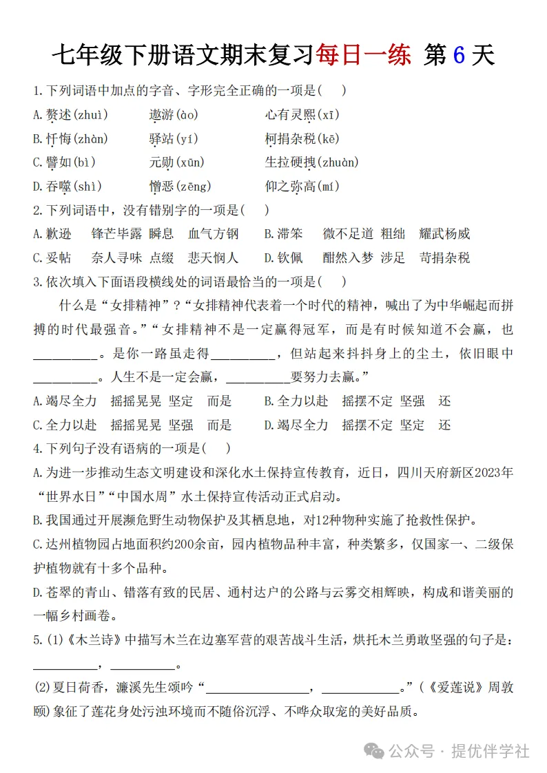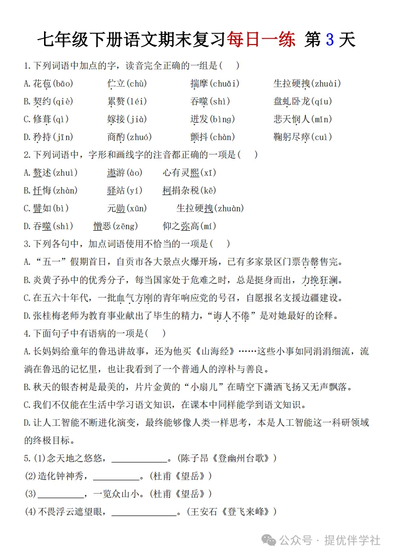 七年级语文下册《每日一练》,可下载