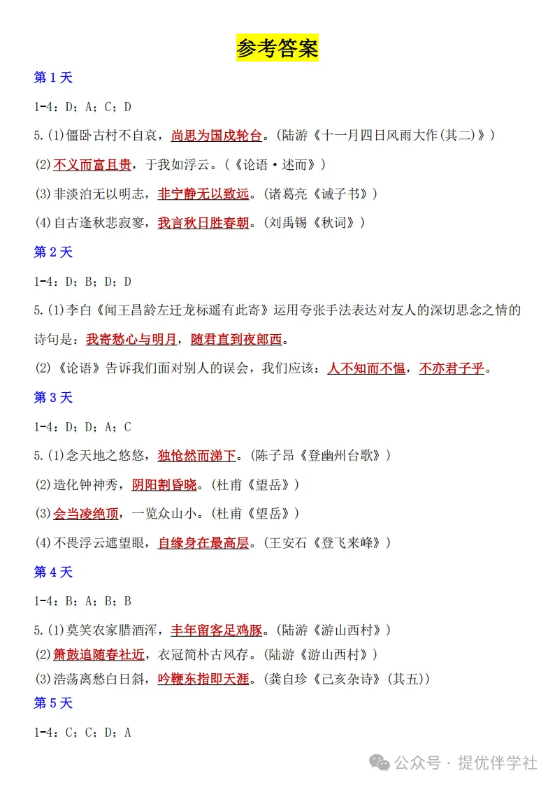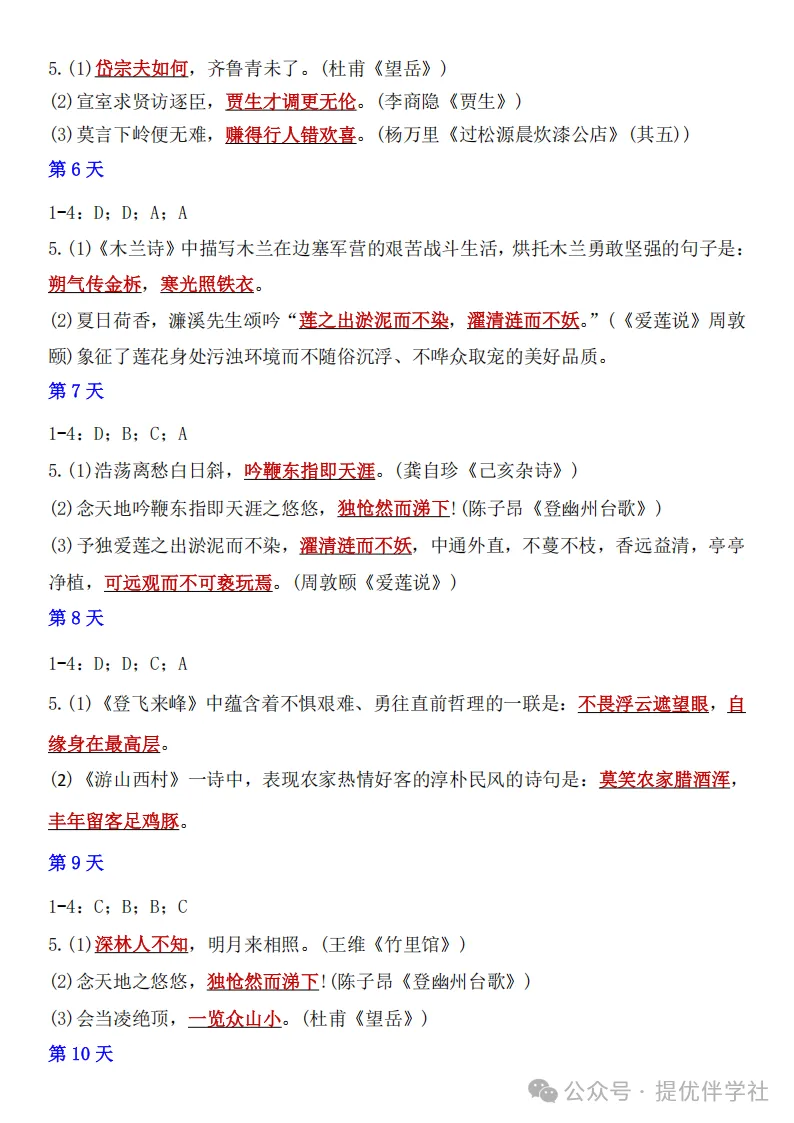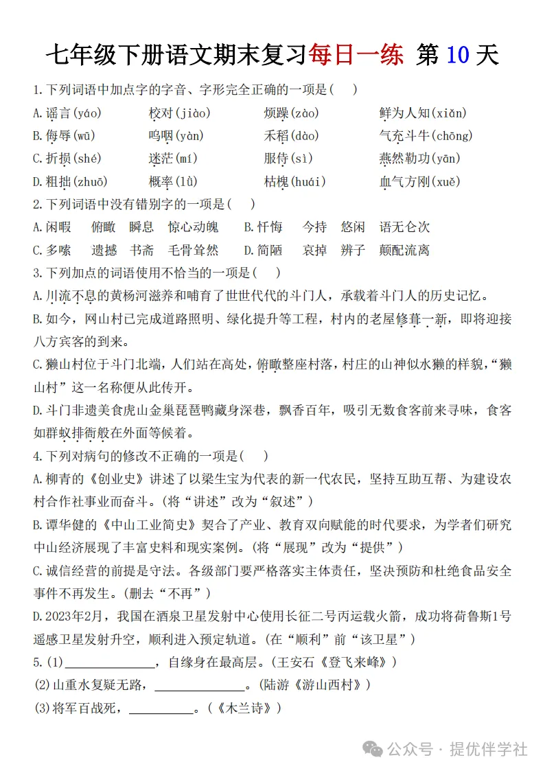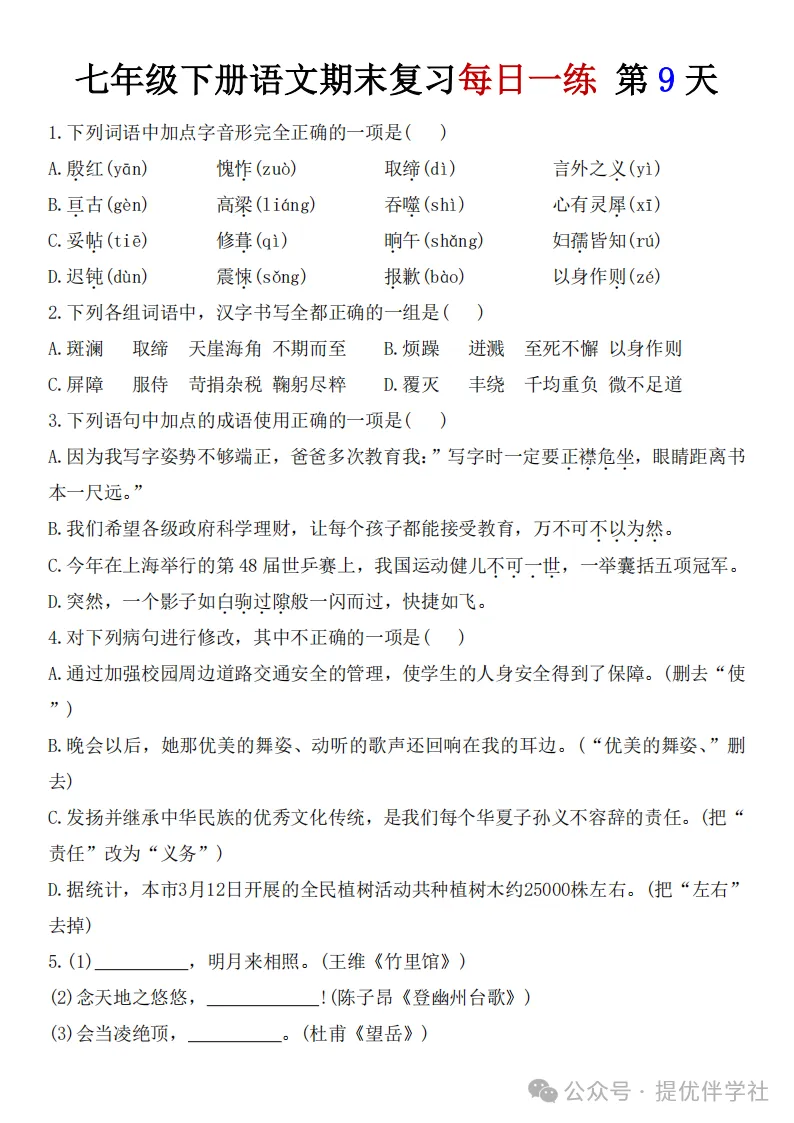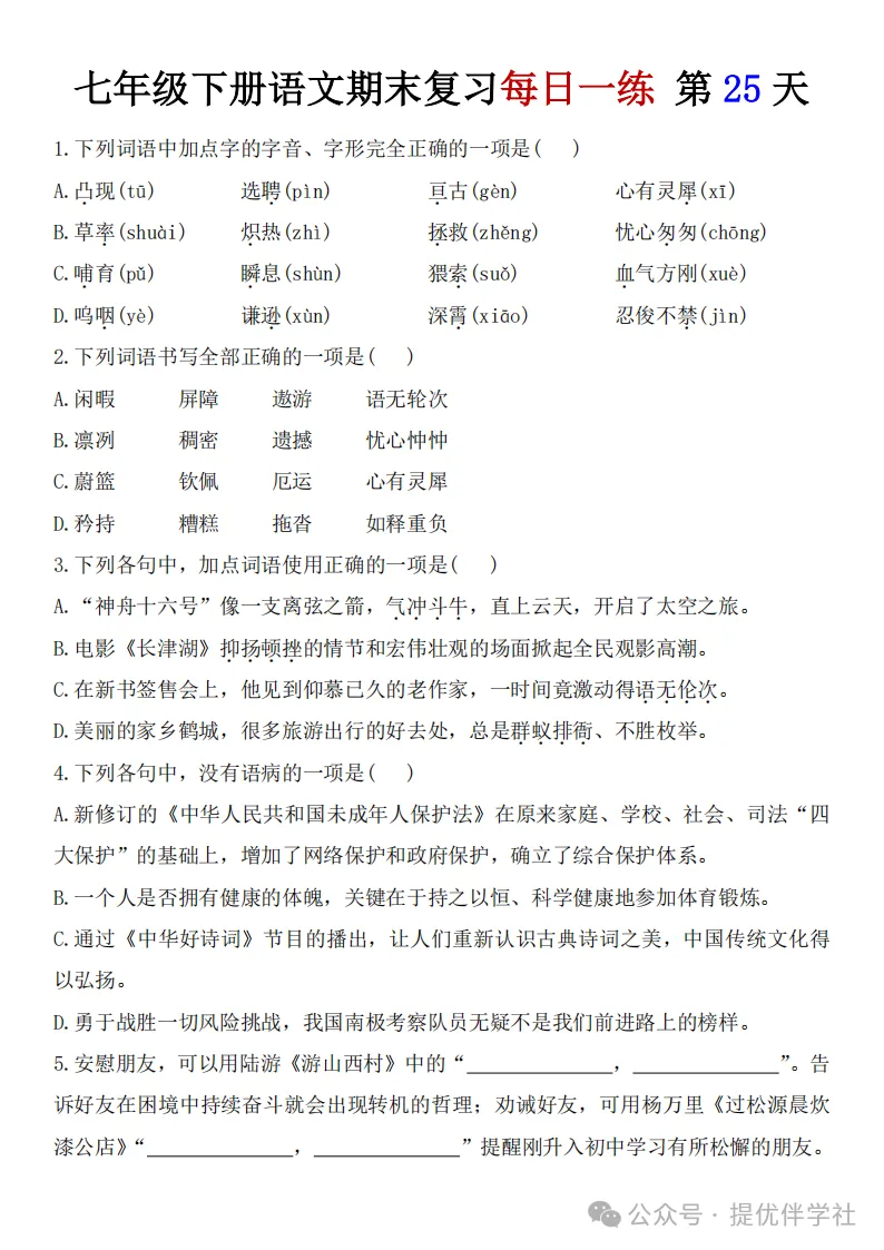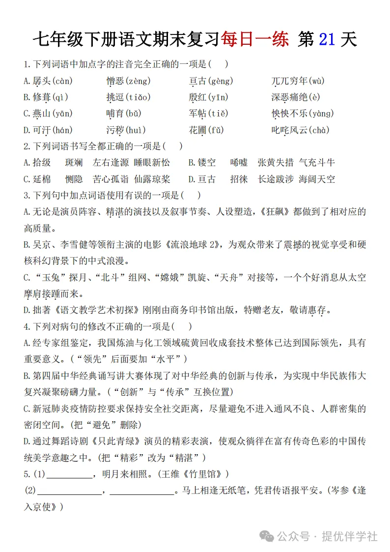 七年级语文下册《每日一练》,可下载