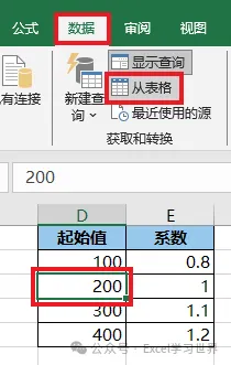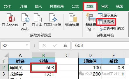 5. 选中右侧数据表的任意单元格 –> 选择“数据”–>“从表格”