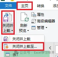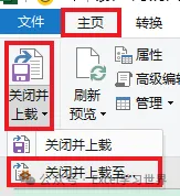 3. 选择工具栏的“主页”–>“关闭并上载”–>“关闭并上载至”