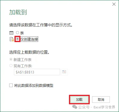 4. 在弹出的对话框中选择“仅创建连接”–> 点击“加载”