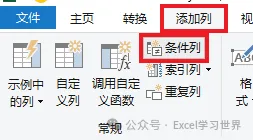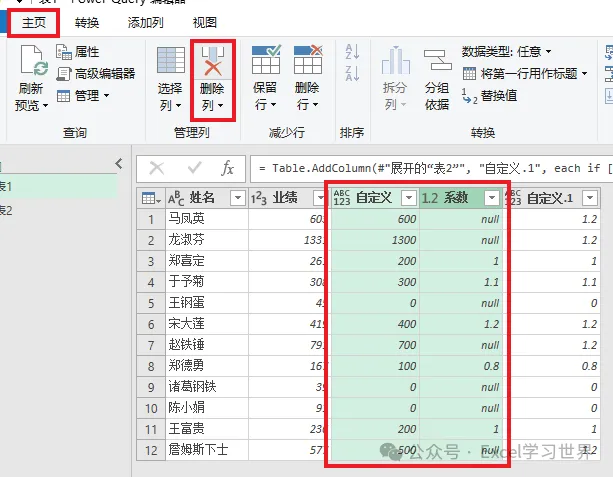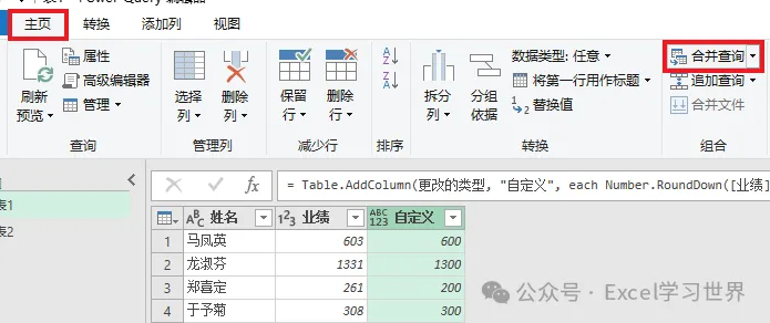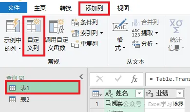 7. 选中“查询”区域中的“表1”–> 选择工具栏的“添加列”–>“自定义列”